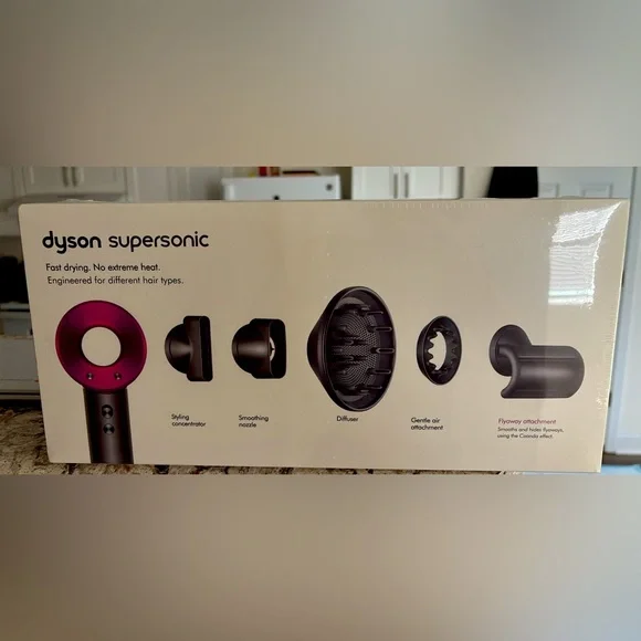 Dyson Supersonic hair dryer with multiple attachments. Sleek design with pink accents.