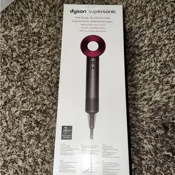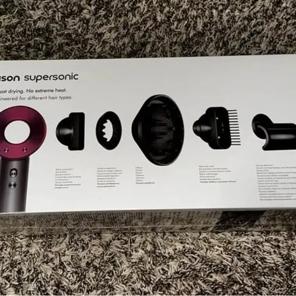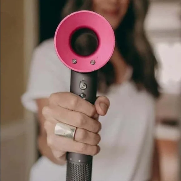 Experience fast drying with the Dyson Supersonic Hair Dryer. Features a sleek pink and gray design.