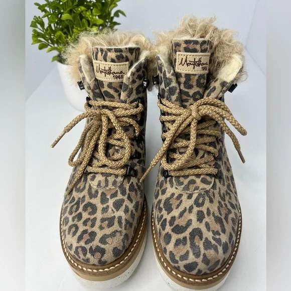 New, never worn! La Montelliana Livia Genuine Shearling Lined Leopard Hiking Boot.Size US 5 / UK 35. Smoke free home. Animal spots bring wild style to this rugged-yet-refined...