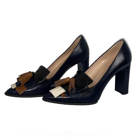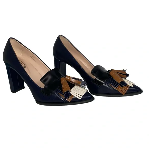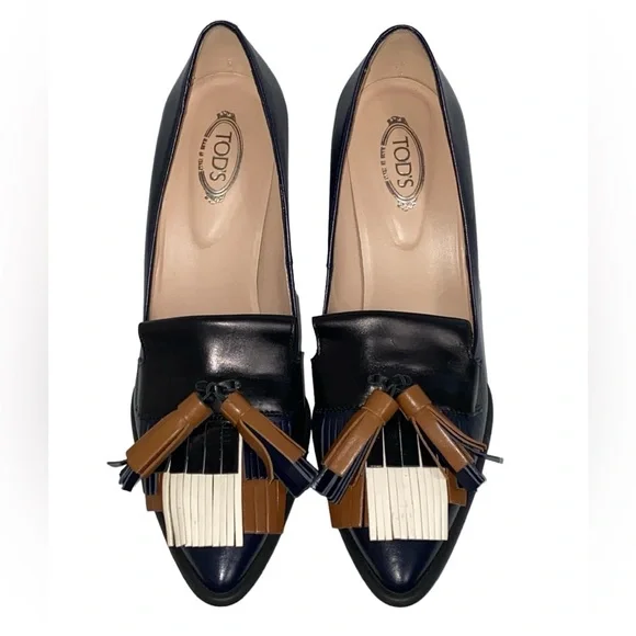 Tod´s Black Brown Cream Leather Fringe Loafer Pumps Size 7.5/37.5Flawlessly fit your feet, these black brown and cream leather loafer pumps are just what you need for the office! These pointed-toe pumps have chic fringes on the vamp and 4” heels. The padded insoles are lined with leather featuring the brand label.Gender -women’sSize 7.5 /37.5Exterior Material- LeatherLining Material- LeatherInsole Material- LeatherSole Material- RubberOrigin - ItalyClosure Type- Slip onHeel Size - 4”Gently used excellent condition please see pictures for condition