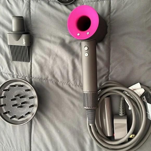 Dyson supersonic hair styler with attachments in fuschia and box for storage