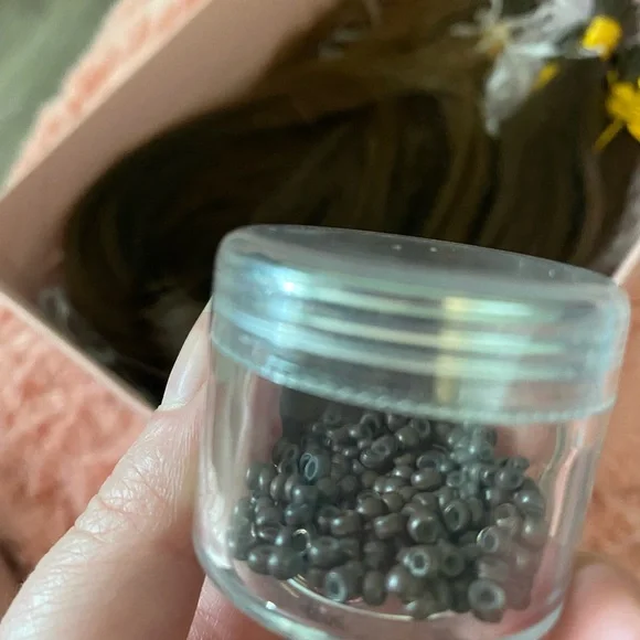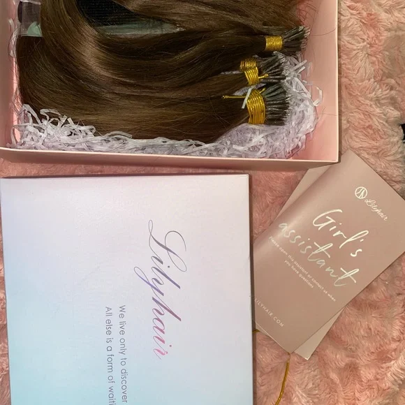 The brand is Lilyhair. These are 100% virgin hair extensions. They are also brand new never been worn. As you can see in the picture they still have the security band tied around them. These are nano rings, they are 200 strands and about 1g per strand. Since there are 200 strands, this hair all together is 200g. Length is 16 inches long. The texture is silky straight. The color is chestnut brown, the pictures with the flash especially make them appear alot lighter. This also came with a hair extension kit, it came with a rat tail comb, the nano beads you will need to install them, and a Velcro accessory used to assist with installing hair extensions to prevent flyaways. (All of these will be pictured above) If you have any questions about this product or the accessories just ask!If also comes with a manual for proper care instructions. *There is nothing wrong or damage to this product, they are brand new, by the time they arrived I had decided to take a break from extensions so I no longer need them*