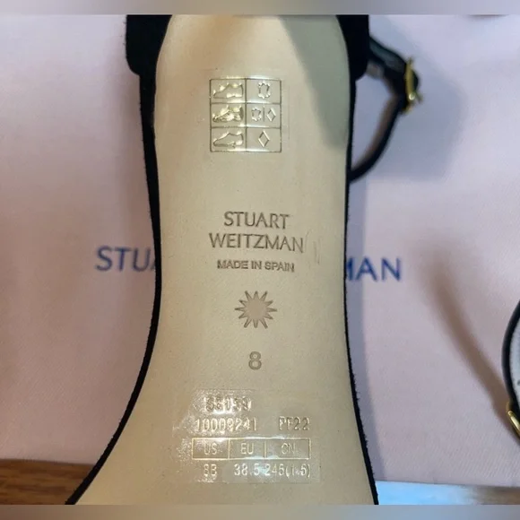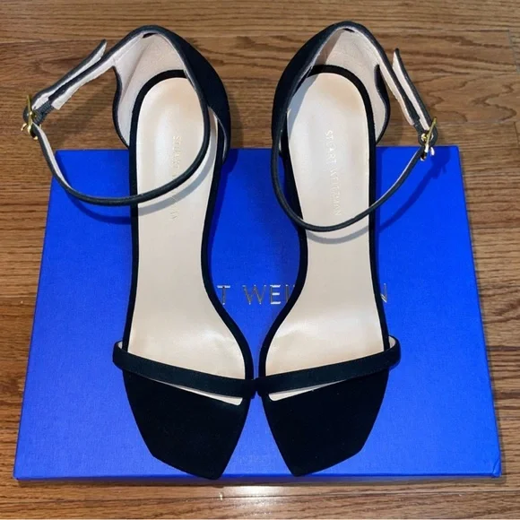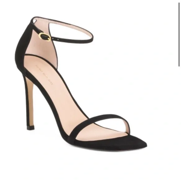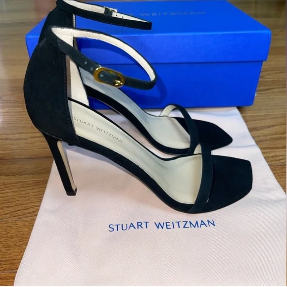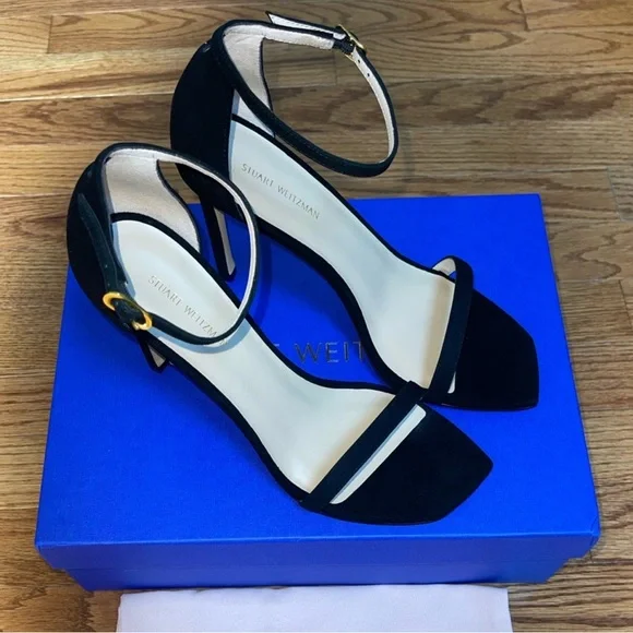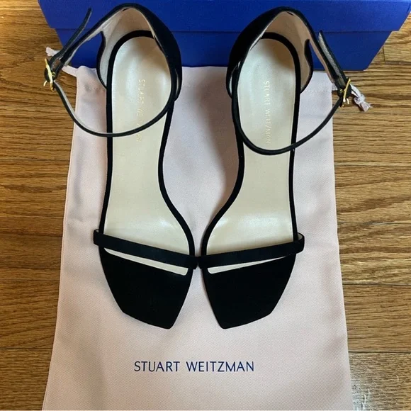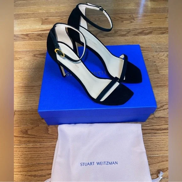 NEW Stuart Weitzman Heels Color BlackSize 8Box and dust bag included.DetailsAdjustable ankle strap, stiletto heel 4in. heelOpen toeSuede upper, man made sole Imported, made in Spain Style.Heel height: 4 inches.