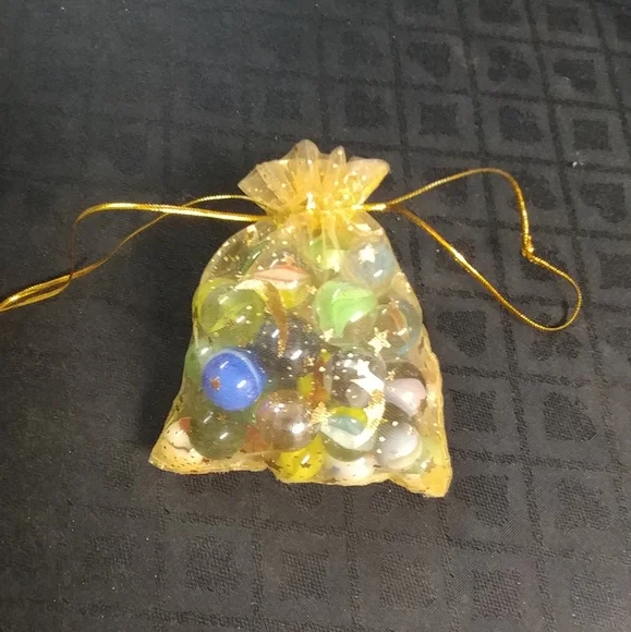 Vintage Marbles, Assortment of colors and sizes with gold metalic string draw bag.