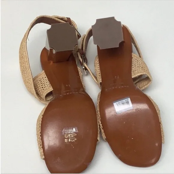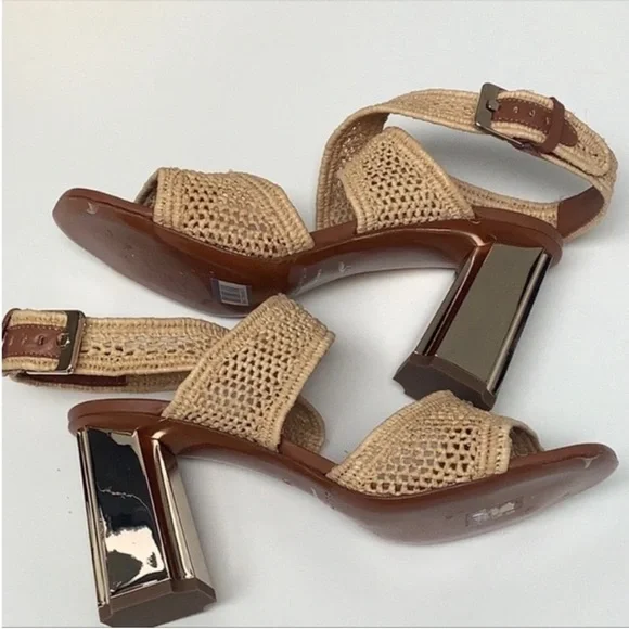 Natural raffia ankle wrap tan leather Robert Clergerie gold block heel sandals - NWOT - tan natural raffia toe strap & ankle wrap straps - adjustable side buckles - tan leather...