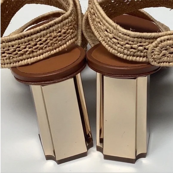 Robert Clergerie Tan Leather Natural Raffia Ankle Wrap Gold Block Heel Sandals 9