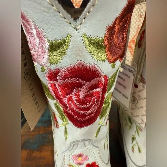 One of a kind Liberty Black Ginebra gray floral embroidered boots. New with tags