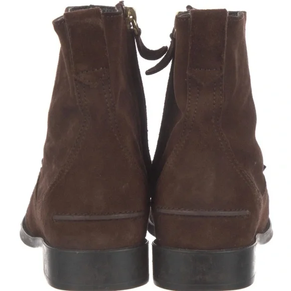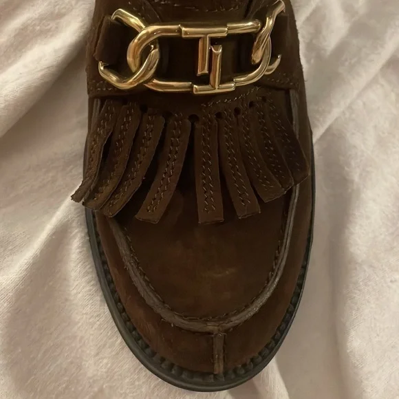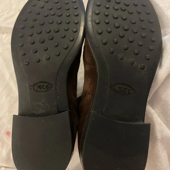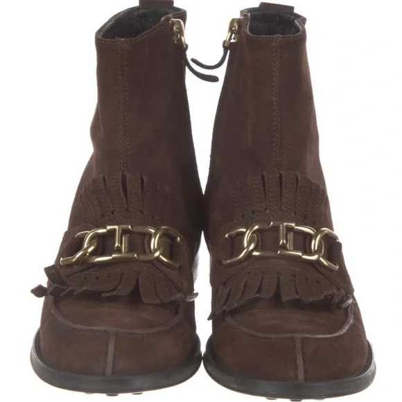 Tod’s AUTHENTIC Dark Brown Scarpa Donna Stivaletto Suede Booties Gold Chain Excellent ConditionEU Size 35Description•Tod´s Suede Ankle Combat Boots•Brown•Round-Toes•Block Heels•Concealed Zip Closure at Sides•Includes Dust BagHeels: 1"EU Size:35Shoe Size: 5Color: BrownCondition:Boots are in Excellent condition Slight wear at insoles; light scuffs at soles. See pictures and video for further condition and information of shoes. REAL - 435[25]