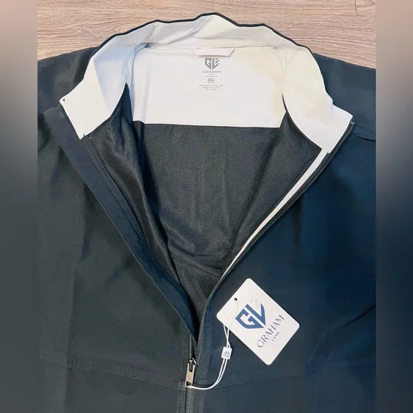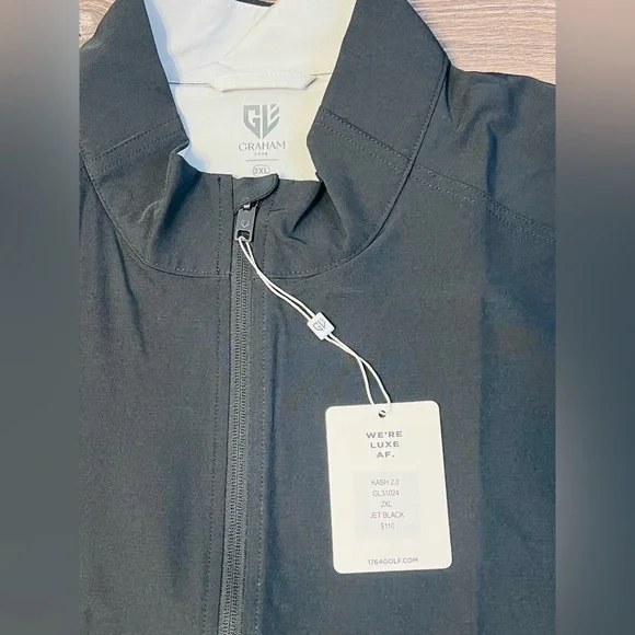 Graham Luxe Men’s Lightweight XXL Water Resistant Full Zip Golf JacketNWT. Great lightweight jacket for golf or a business casual day. Color: Jet Black with Gray around the collar. Super comfortable! 97% Polyester, 3% Spandex.