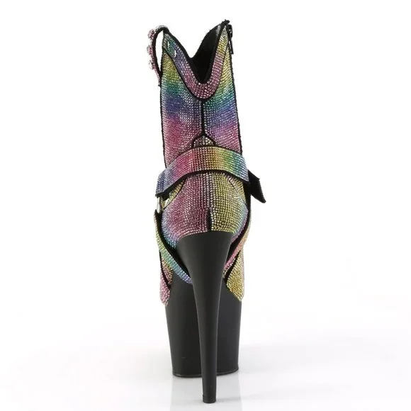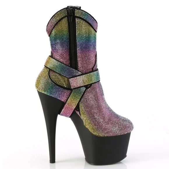 7" High Heel, 2 3/4" Platform Cowgirl Rhinestone Ankle Boots. Detachable O Ring and Straps. Inner Side Zipper Closure.Styles: dance clubbing dancer stripper dancing rainbow prideRODA-1029RS