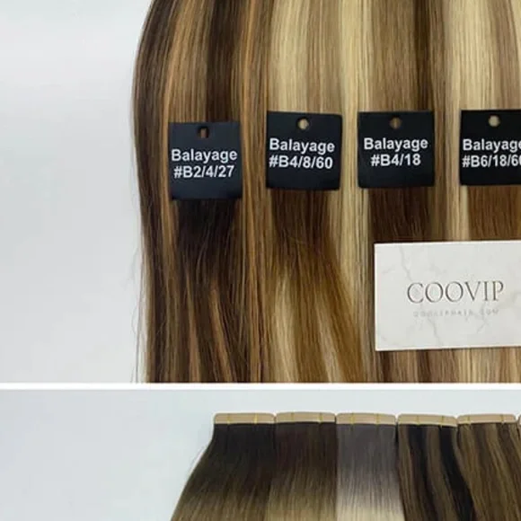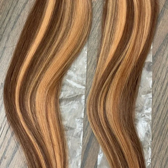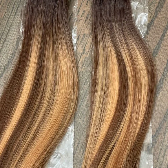 Brand new invisible tape in hair extensions. 40 pieces. 100 grams total. Unfortunately, these colors did not work with my hair and I was unable to return them. Pretty annoyed, not gonna lie! I paid $367 for these. The hair feels super soft and silky. The color is a warm brown with coppery toned highlights. Ordered from COOVIP.