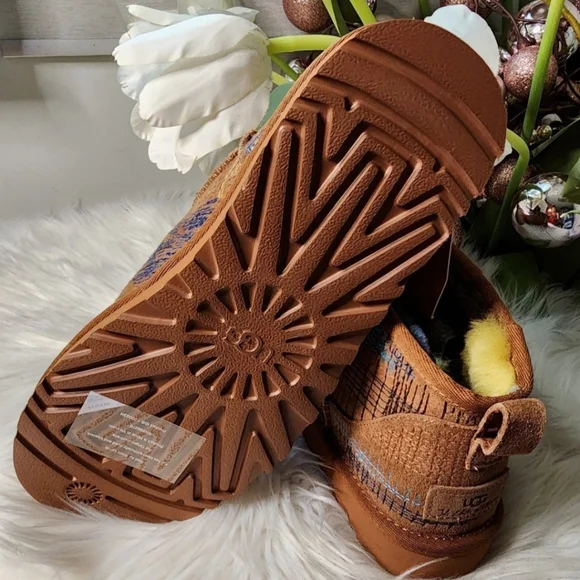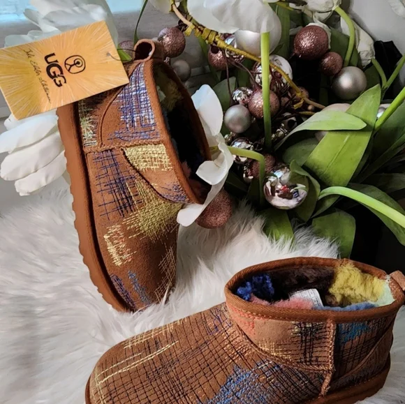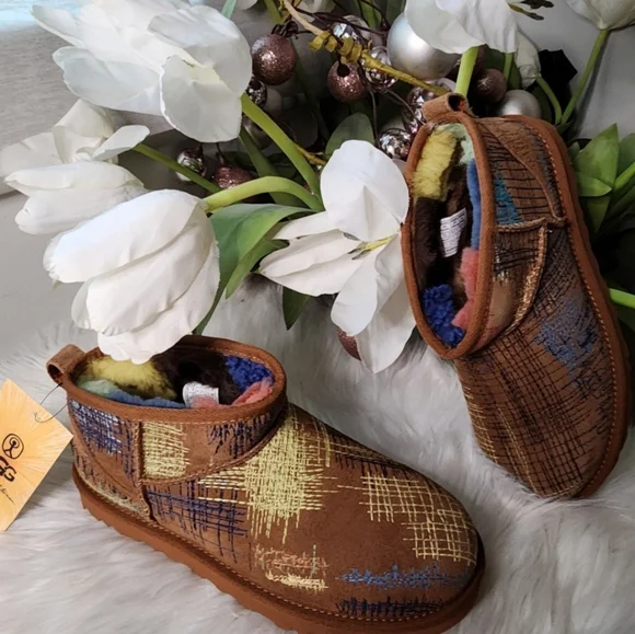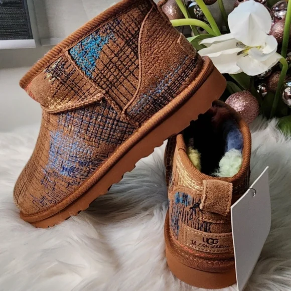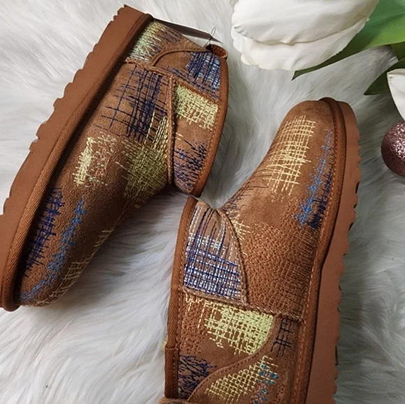 Ugg TheElder STATESMAN SUEDE BROWN BRAID COMFORT Women BOOTSSizes8910A patchwork of embroidery slashes the upper of this iconic bootie refreshed in a color-pop collab with LA-based streetwear icon The Elder Statesman. Plush shearling in a playfully checkered motif floods the interior of this cold-weather favorite grounded on a buoyant Treadlite sole designed for reliable wet-dry traction.Brand new without box