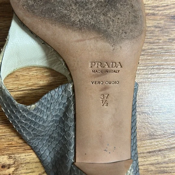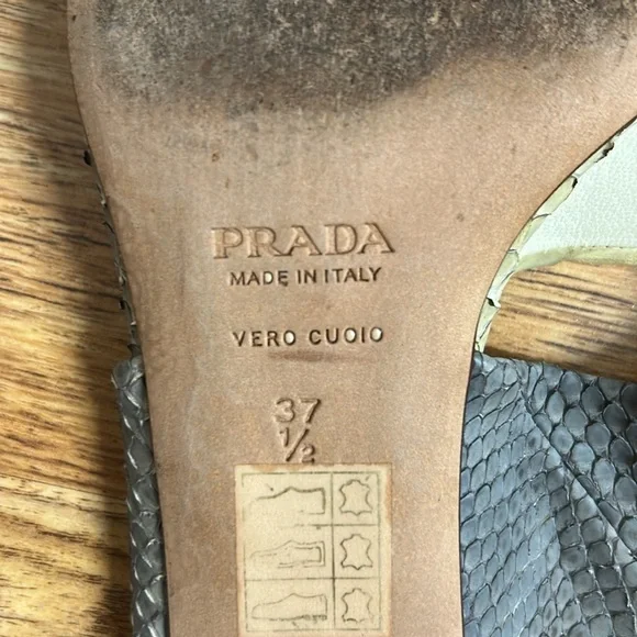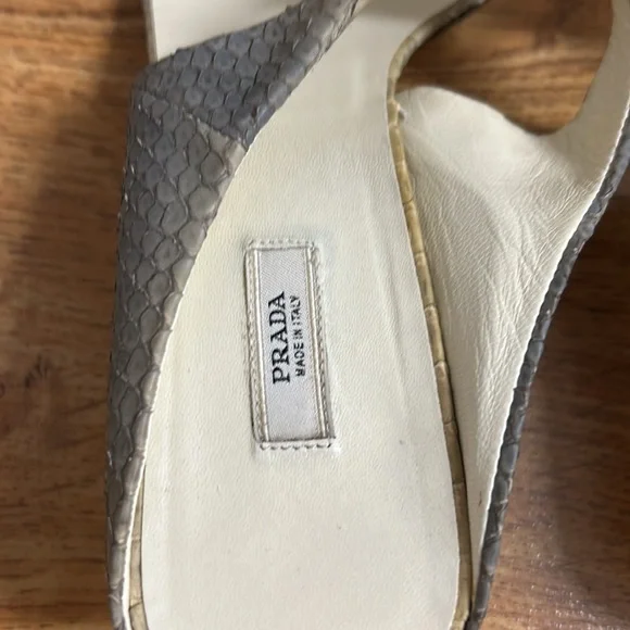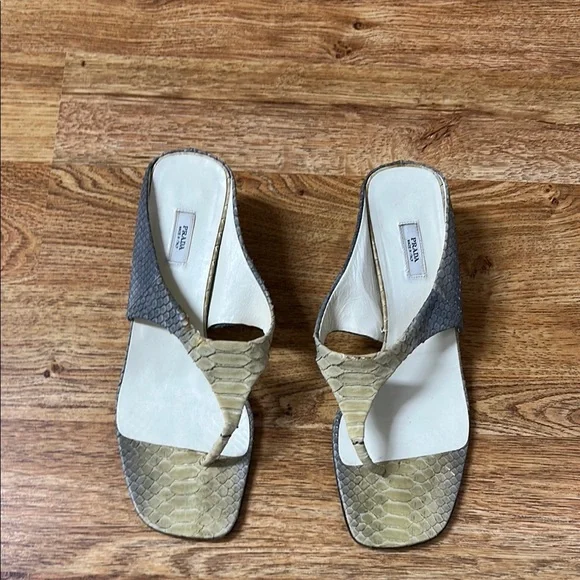 Chic Prada sandals with a stylish gray and cream design. Perfect for any occasion.
