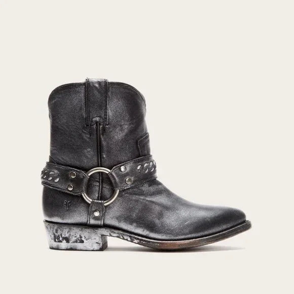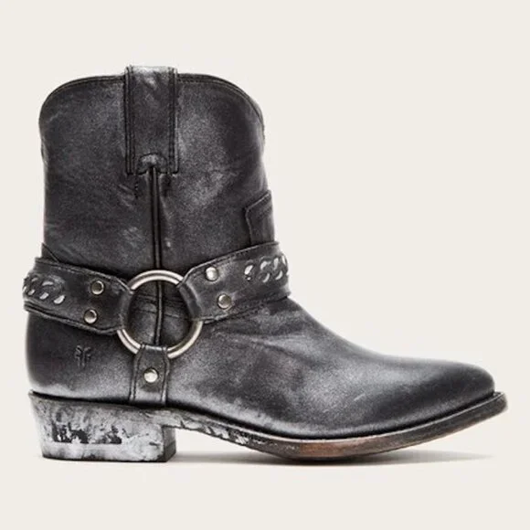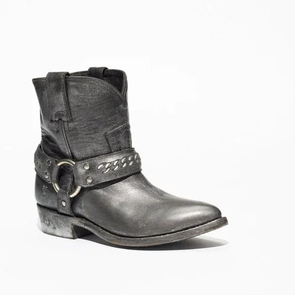Frye Billy Chain Black Multi Metallic Short Harness Cowboy Boot Size 6New without original boxThis boot is all about the leather. Beautifully handcrafted, clean lines, sleek pitched heel, flexible sole and tonal stitching make sure there´s no doubt the leather is the real hero here. Detailed with a heavily buffed silver chain within leather piece that represents the Wild West American influence. Metallic paint is hand applied to finished pairs for a unique twist on our classics. The paint will wear down over time making each pair one-of-a-kind.- Leather lined- Rubber outsole- Antique silver hardware- Goodyear welt construction- 6 7/8" shaft height approx- 1 1/4" heel height approx- Pull onCustomer Service Policy: We are not an expert on everything we sell, so some of our knowledge may be limited. As for shoes and clothing on manufactures overall fit Items are retail store purchases and may have been handled or tried on by store customers Prior to sending, photos are taken of item with shipping label and a zip tie tag attached to represent the item purchased and shipped