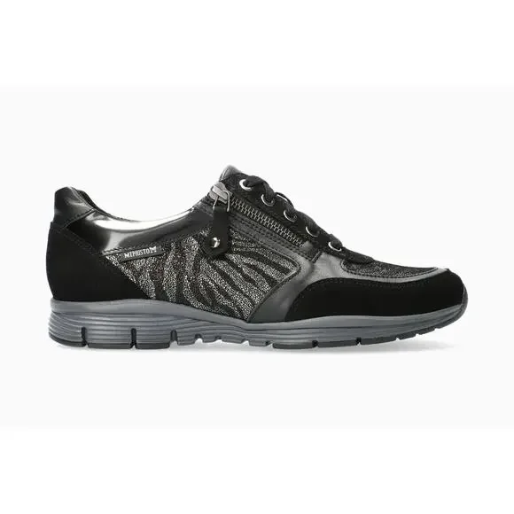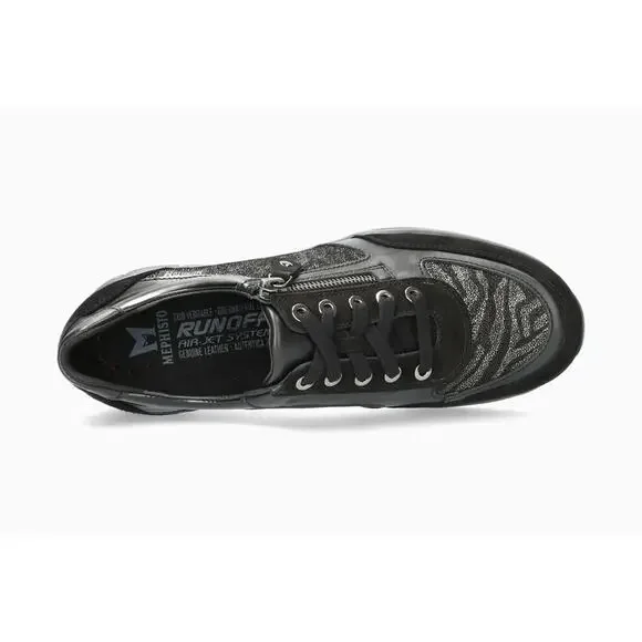 Mephisto Womens Ylona Leather Sneaker - Black Velcalf PremiumNew in BoxA lot of sneakers are designed to go unnoticed – to be functional and comfortable, but not make a scene. The Ylona didn’t get that memo. Ultra-lightweight, well-built, and sporty? Absolutely. Fun, flashy, and modern? Different leather finishes are combined with pops of pattern and color for an unmistakable entrance. A side zipper adds to the punky charm, while also making the on/off routine a snap. Exclusive AIR-JET technology in the footbed keeps fresh air circulating throughout, while a shock absorbing insert in the outsole protects soaks up your strides and takes the strain out of a day spent on the go. * Material: VELVET LEATHER * Lining: LEATHER LINING * Fastener: ZIPPER LACES * Width: G (standard width) * Heel Type: FLAT HEEL, 1.0 cm * Removable Footbed: YES