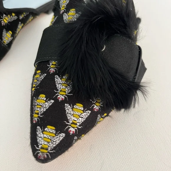 Frances Valentine Pauline Bee Print Black and Yellow Mules with Rabbit Fur