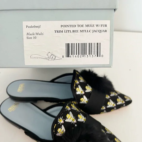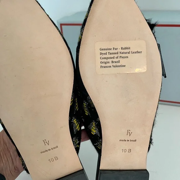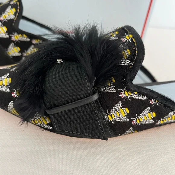 Step out in style with these chic Frances Valentine women´s shoes with rabbit fur detail. Featuring a striking jacquard bee print in black and yellow, these shoes are perfect for adding a touch of elegance to any outfit.