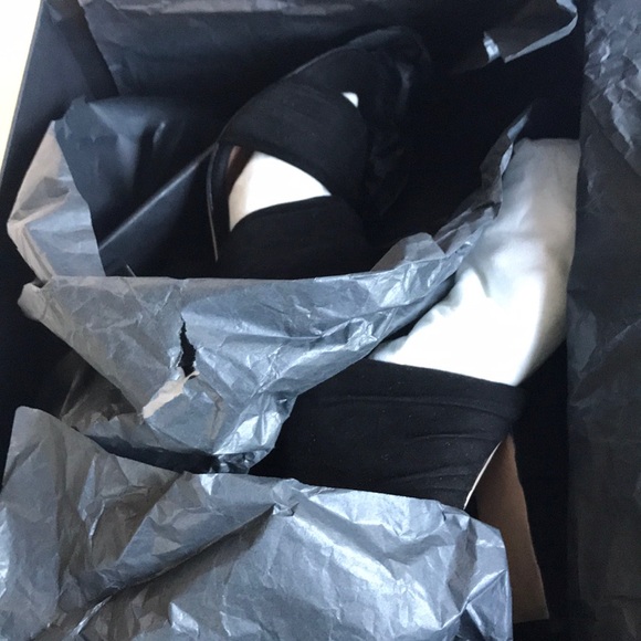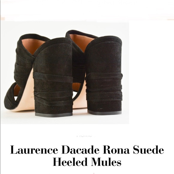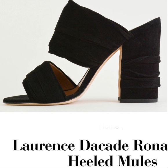 Laurence Dacade mulesBlack crinkled suedeOpen toes with a toe band & wide vamp bandPadded bandsSlip-on with open backsIncludes a dustbagChunky covered heel 4 1/4"Made in ItalyMaterial: Suede/LeatherStyle: RonaColor: BlackComes in original box