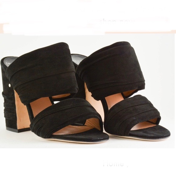 Laurence Dacade mulesBlack crinkled suedeOpen toes with a toe band & wide vamp bandPadded bandsSlip-on with open backsIncludes a dustbagChunky covered heel 4 1/4"Made in...