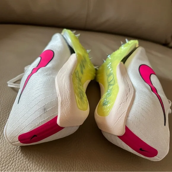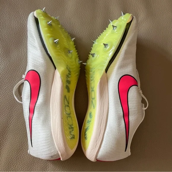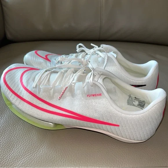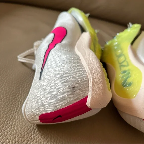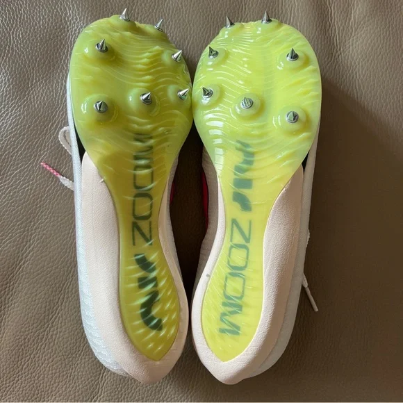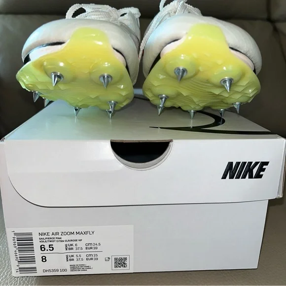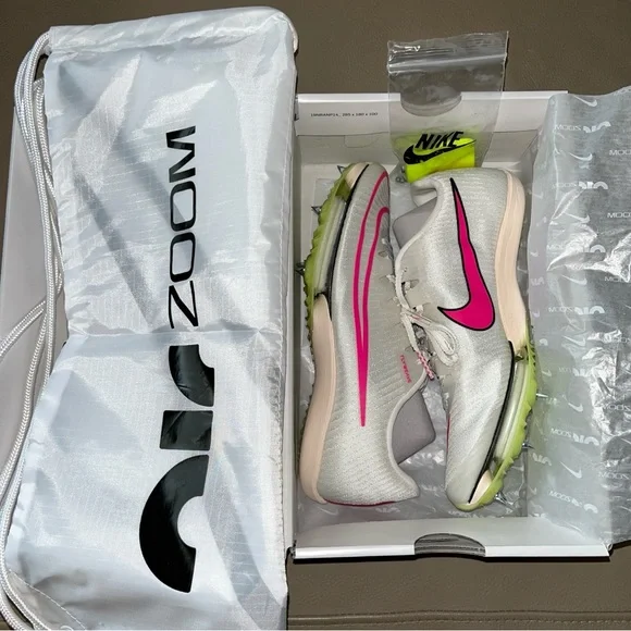 New in box Unisex Authentic NIKE AIR ZOOM MAXFLY TRACK SPIKES Flyweave size Men 6.5/Women 8 White Sail/Fierce Pink /Voile/Twist /Citrn Clear/Rose Vif. Personal record/best time with these attractive lightweight running track spikes. Ideal for sprints, hurdles events. Stored & kept as a spare. Noticed a slight factory blemish/marking on back of left shoe, will not affect performance! Product as presented, everything new. Includes Nike shoes with spikes already attached, spike wrench with one extra spike insert, white drawstring swoosh bag & original box. Price firm.