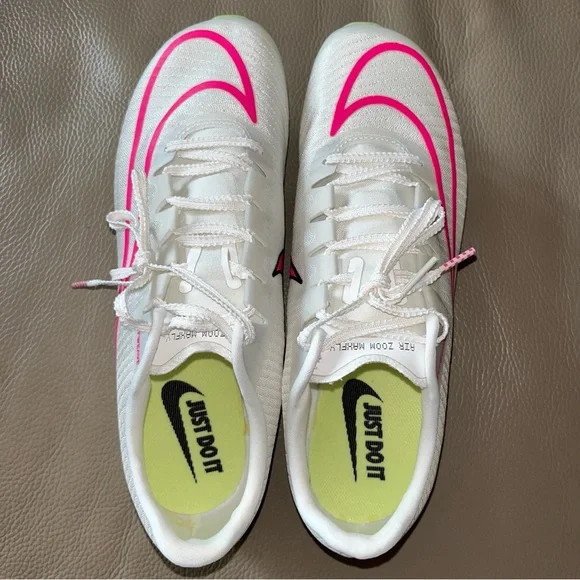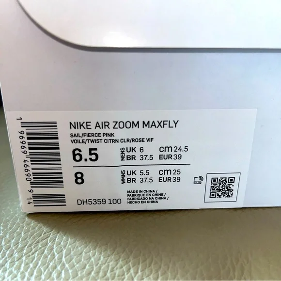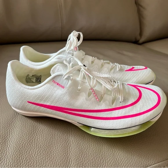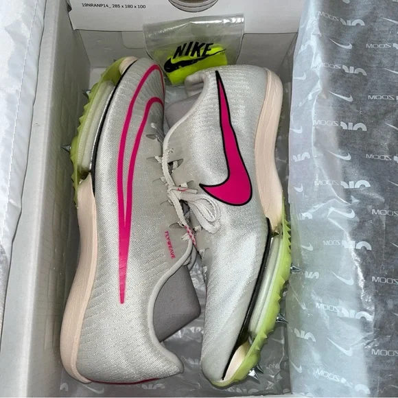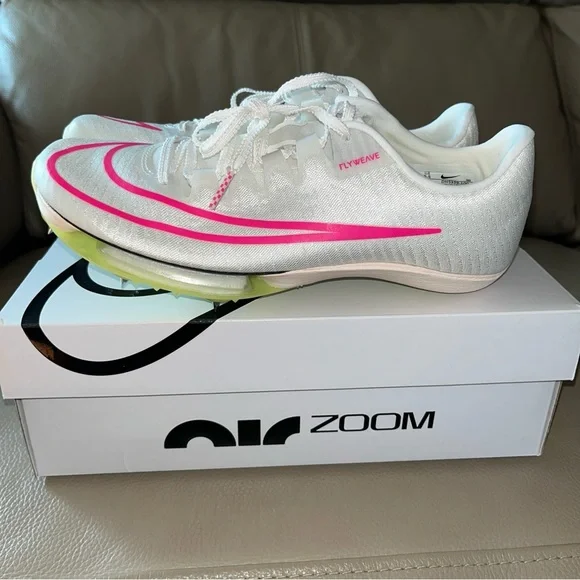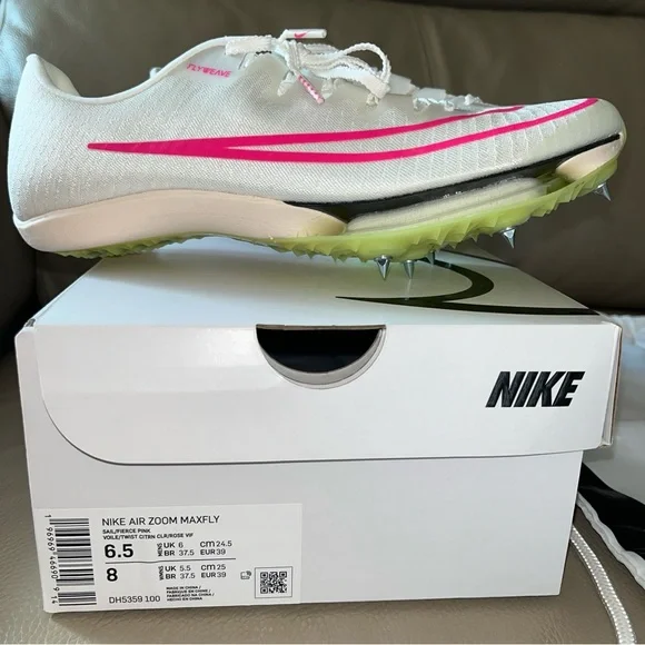 New in box Unisex Authentic NIKE AIR ZOOM MAXFLY TRACK SPIKES Flyweave size Men 6.5/Women 8 White Sail/Fierce Pink /Voile/Twist /Citrn Clear/Rose Vif. Personal record/best time...