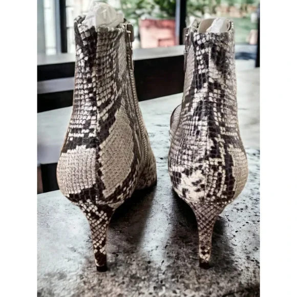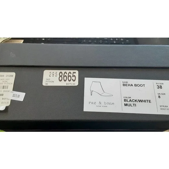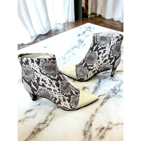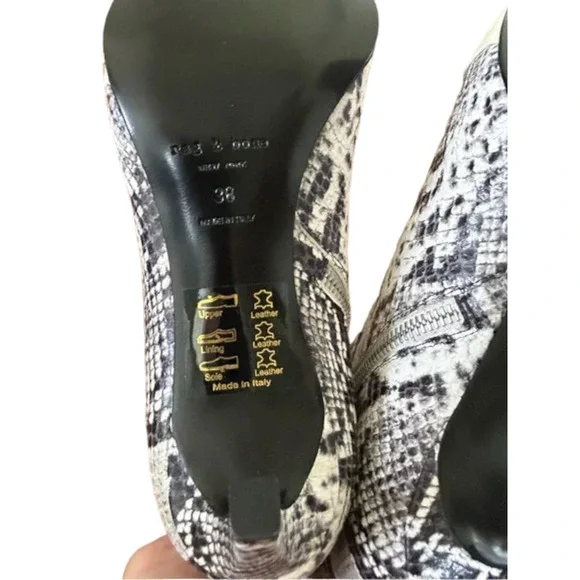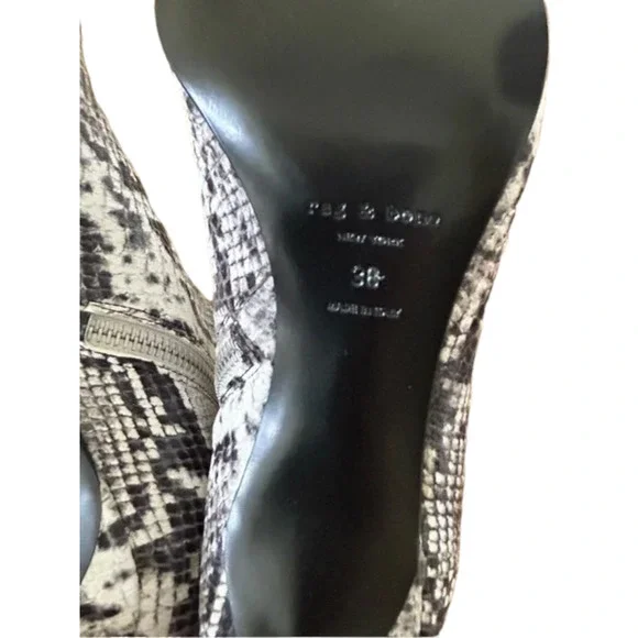 RAG & BONE Beha Elegant Stiletto Heel Leather Ankle Boot Black WhiteSize: 8 (US) 38 (EU)Color: Black/White New with Box and Dust BagRetail: $615 with tax.-Our essential slim stiletto ankle boot. Italian leather construction. All day or all night, fits like a glove.Black / White / Multi - Snakeskin print with off white cap toe detailPointed toeStiletto heelZip up on interior sideLeatherMade in Italy