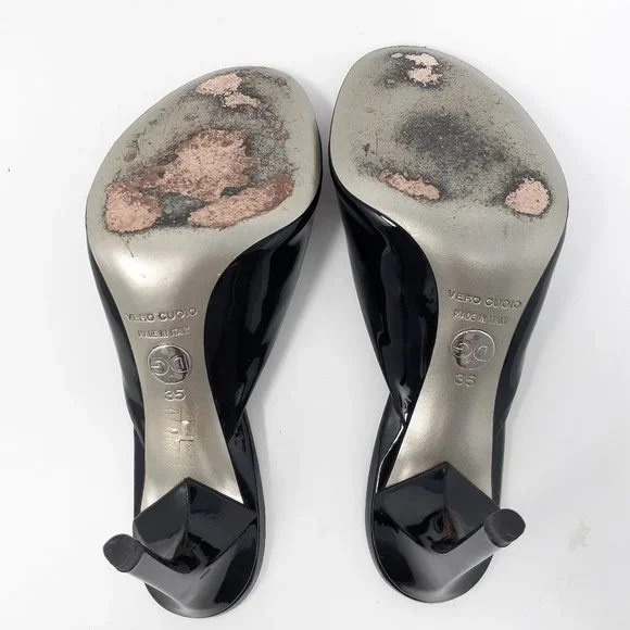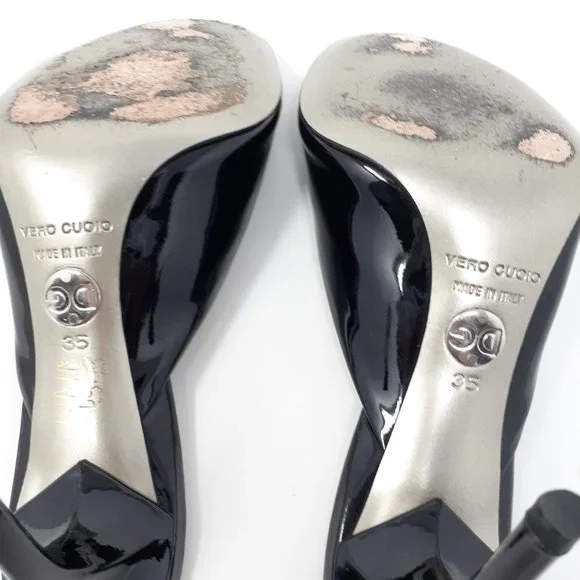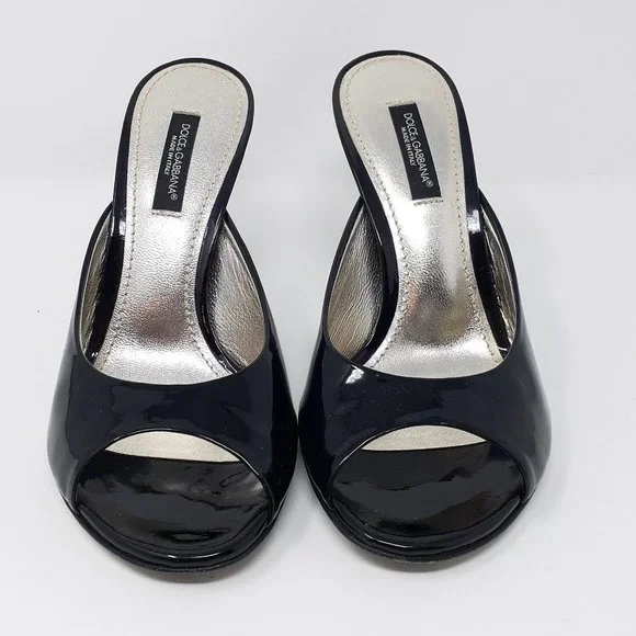DOLCE & GABBANA Black Paten Leather Strapless Stiletto Heel PRELOVED EXCELLENT CONDITION- Minimal signs of wear on soleSize 5DETAILS:Open Toe / Stiletto HeeMEASUREMENTS: HEEL HEIGHT Appr 3 1/2Stiletto HeelCOLOR: Black