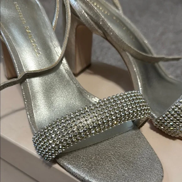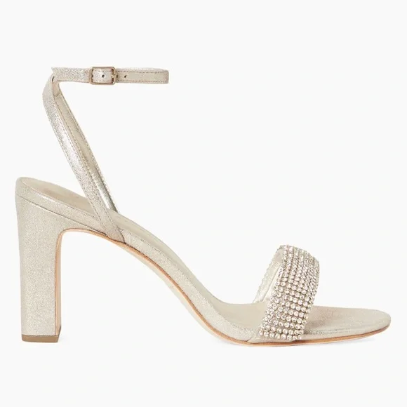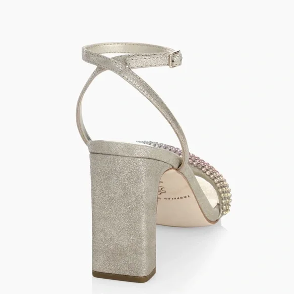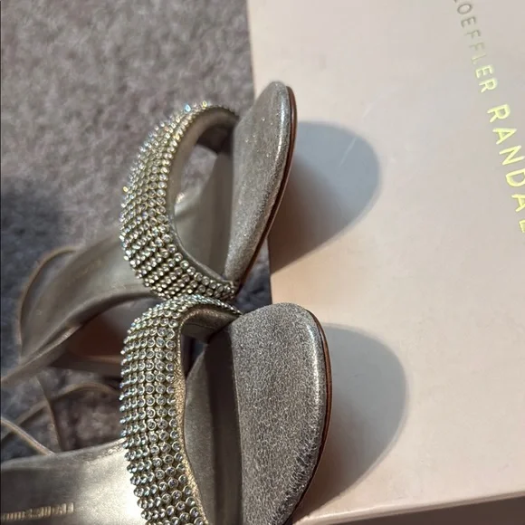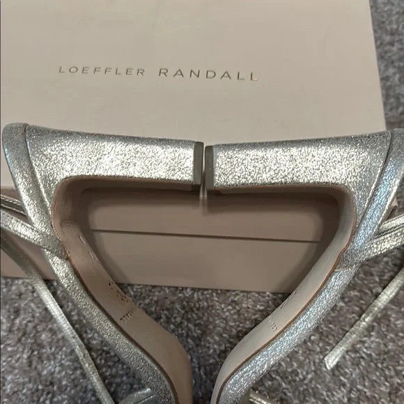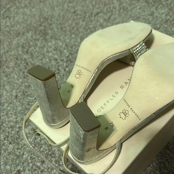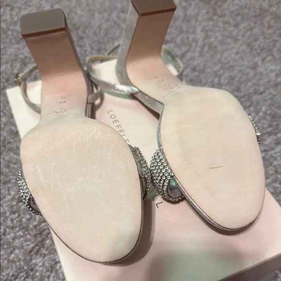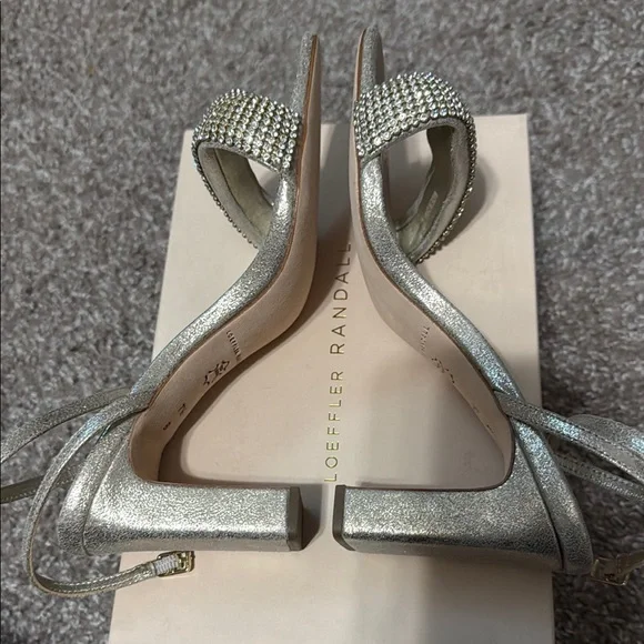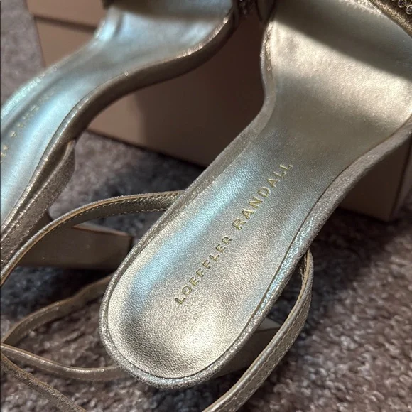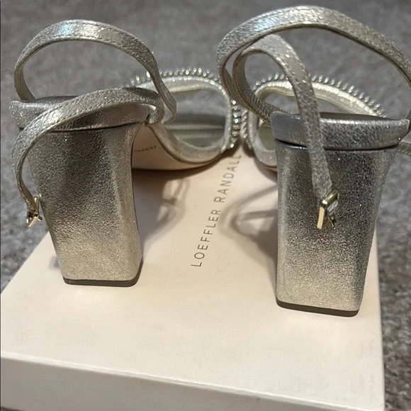 Color code cappuccino.It’s soft platinum color. 3.25” 8.5 cm suede covered block heel.New in the boxEmbellished with a gleaming rhinestone vamp, Loeffler Randall´s Shay sandals are crafted of eye-catching metallic suede. This Italian-made pair is anchored by a block heel.• Suede/rhinestone upper• Round open toe• Ankle buckle strap• Leather sole• Made in Italy