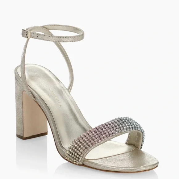 Color code cappuccino.It’s soft platinum color. 3.25” 8.5 cm suede covered block heel.New in the boxEmbellished with a gleaming rhinestone vamp, Loeffler Randall´s Shay...