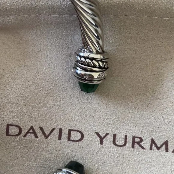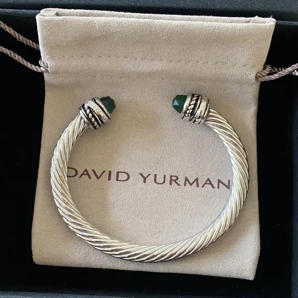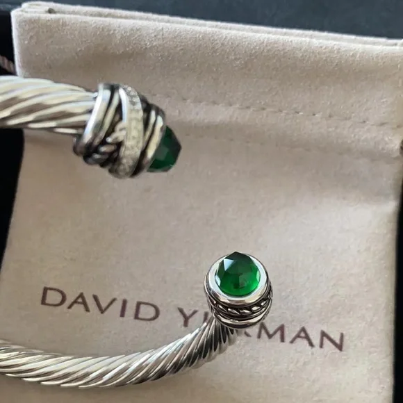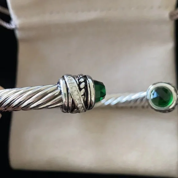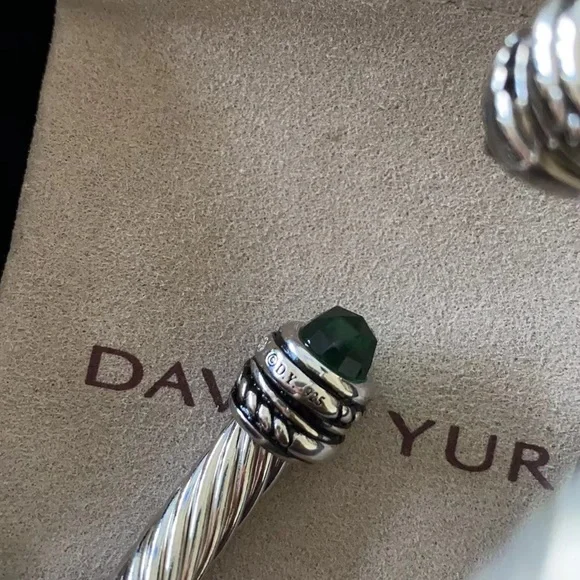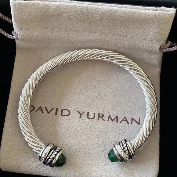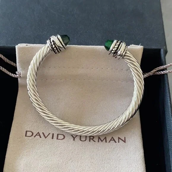 Elegant David Yurman cable bracelet featuring a striking silver design with green gemstone accents. Perfect for adding a touch of sophistication to any outfit.