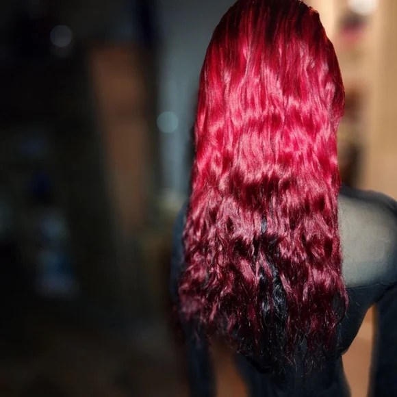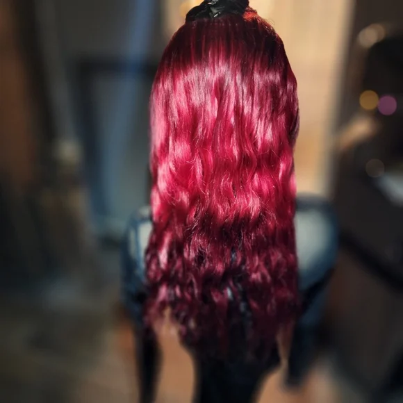 22" split colored bright and dark red and black peekaboo human hair lace wig