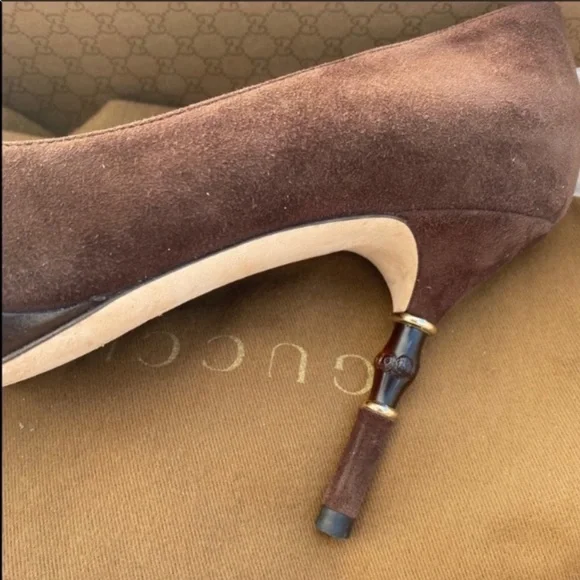 brown coco stiletto with slight wedge has gorgeous bamboo heel imbedded with gold trim and original box.Purposely made to make you feel like a divi Size 5.5.Excellent...