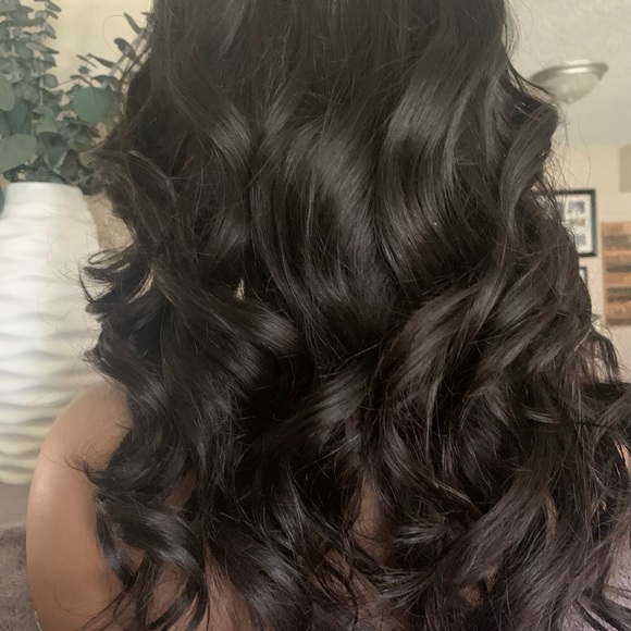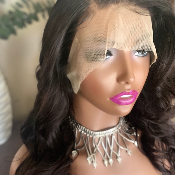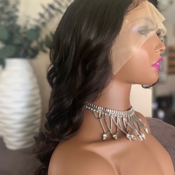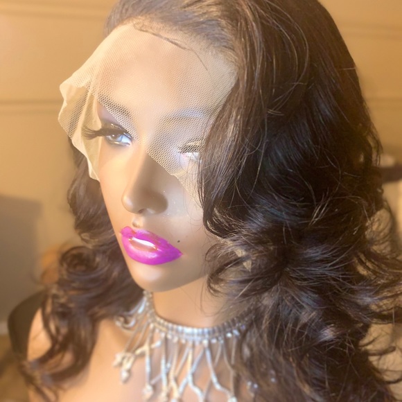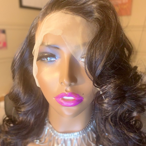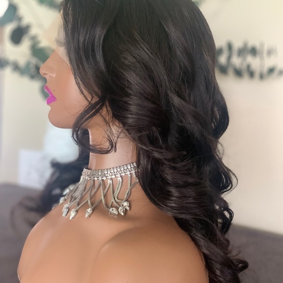 Wig is 13x4 lace closure this is glueless she can be glued down if you like. Soft baby hairs 18 “ soft black layered with body curls