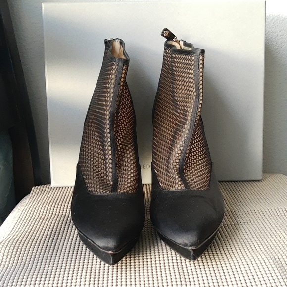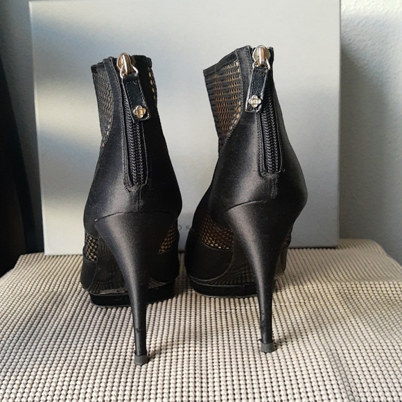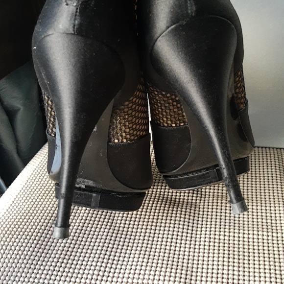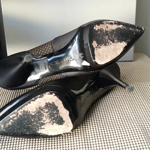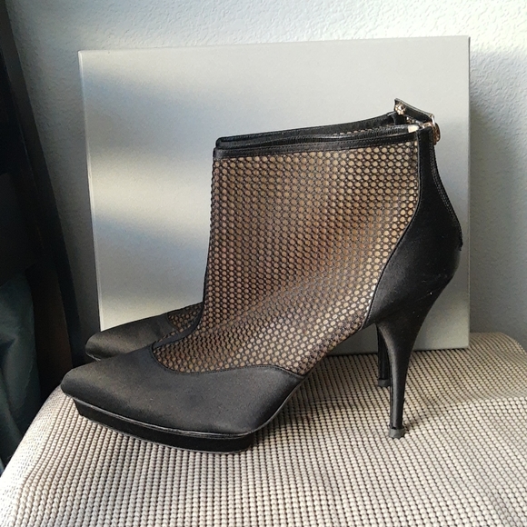 Pre-owned Oscar de la Renta black satin zipped heeled boots in size 41. Heel is 4.5". Shaft height is 3.75" and the circumference is 11". In excellent condition.