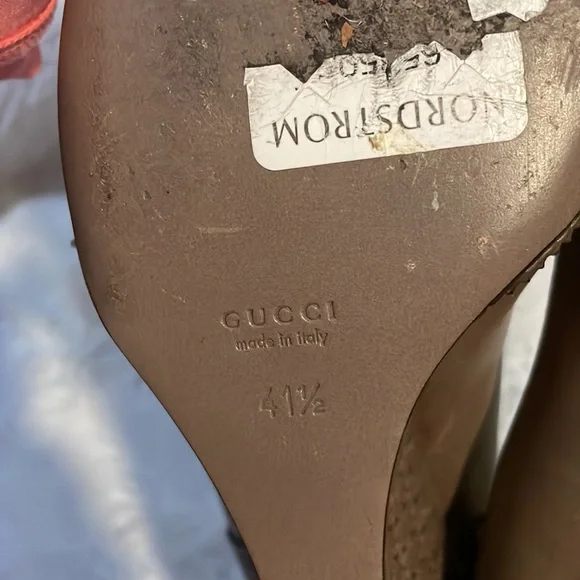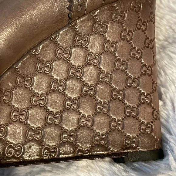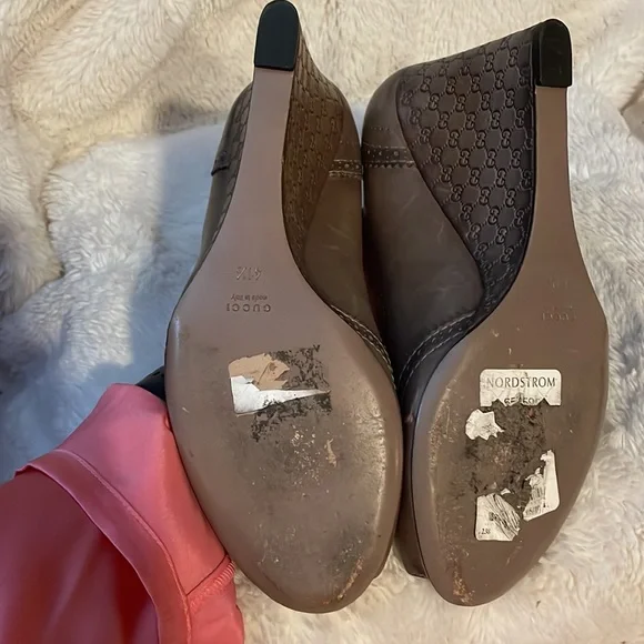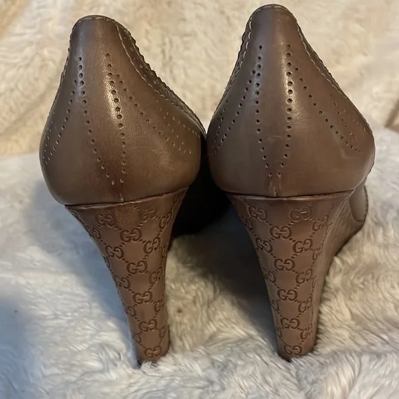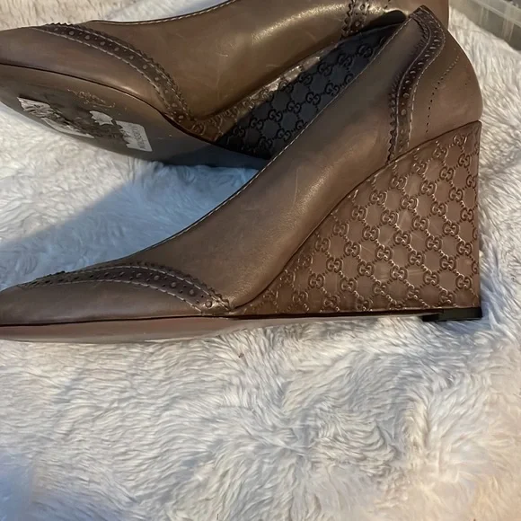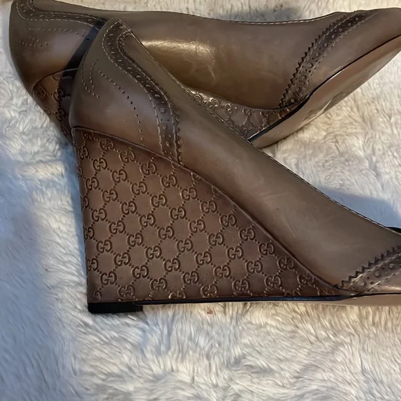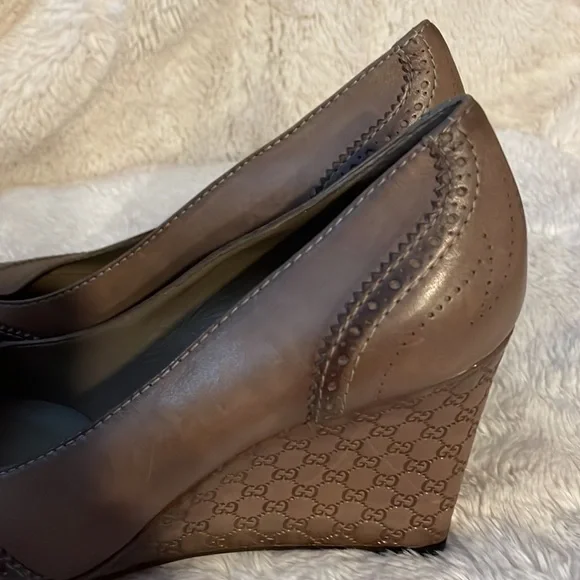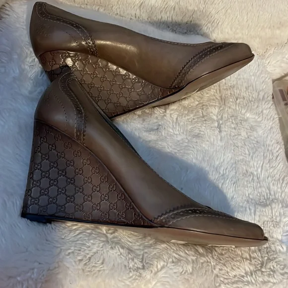 A perfect mix of elegant fashion and comfortable style, these pumps come crafted from brogue leather and designed with peep toes and leather insoles. They´re visually stunning and they stand tall on GG-embossed wedge heels. Wore once.11.5 US