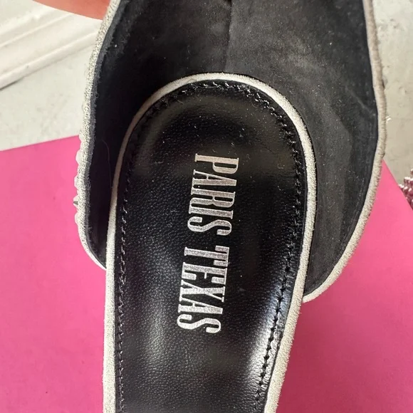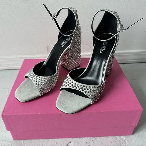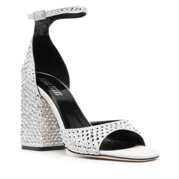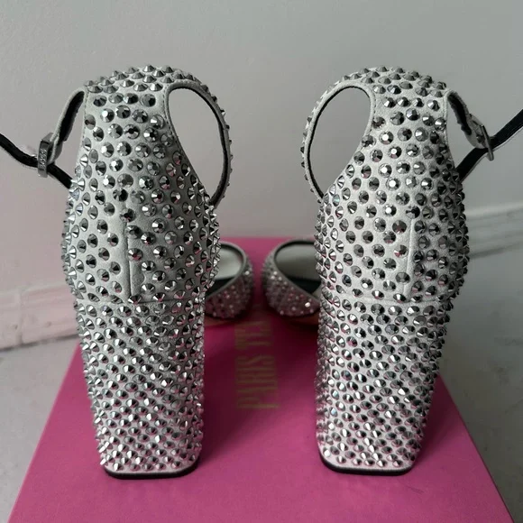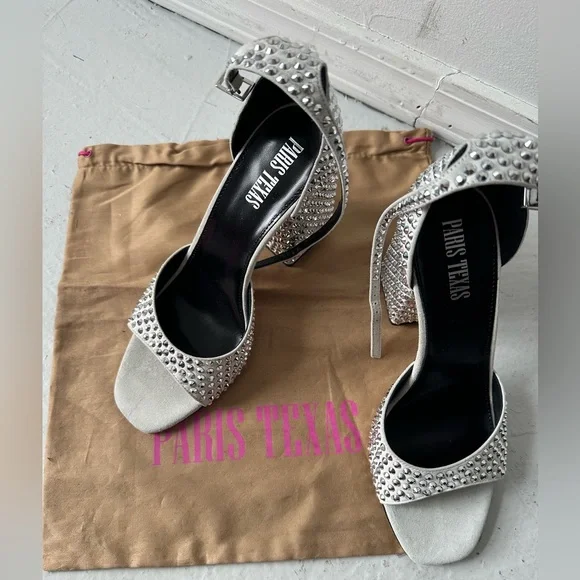 Step into elegance with these Paris Texas high-heeled sandals, featuring white suede and a striking silver crystal design. The chunky heel adds height and sophistication, while the sleek silver toe and ankle straps provide a modern touch. Perfect for making a statement at any event - wedding, bachelorette, bridal, disco, rave, formal event! New in box with dust bag and extra crystals Smoke free pet free homeFast shippingOpen to offers!
