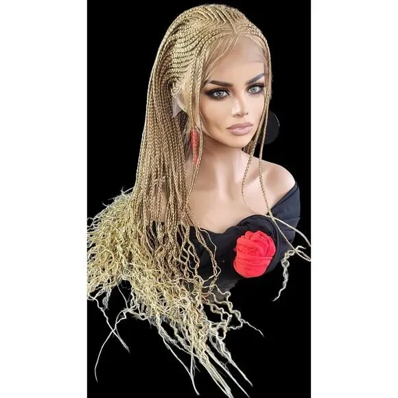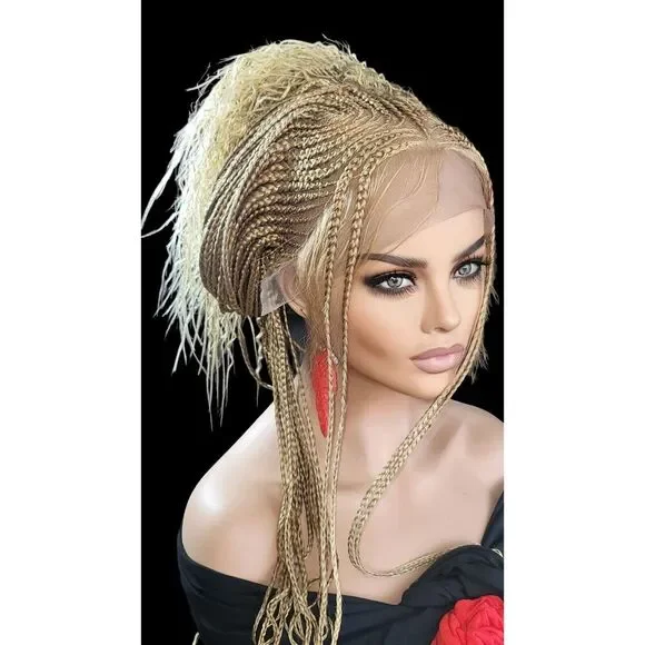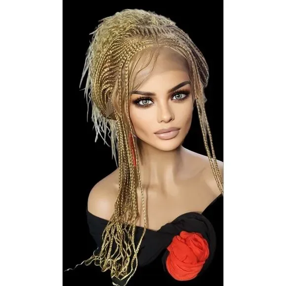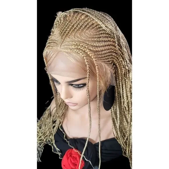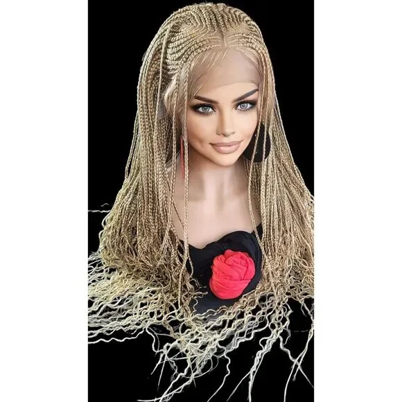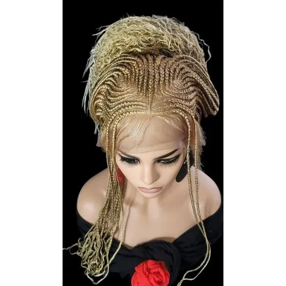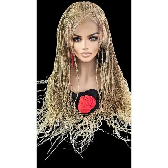 Luxury Blonde Ombre Braid Wig by Magic Braids: Discover the natural look of our full lace, hand-tied wig featuring a stunning 24-inch length.Vibrant Ombre Coloring: Stand out with the dual-tone #27/613 blonde ombre, expertly blended for a sun-kissed, stylish gradient effect.Realistic Baby Hair Edges: The wig includes finely crafted baby hairs around the perimeter, mimicking a natural hairline for an undetectable finish.Innovative Braid Design: Enjoy the blend of traditional feeding cornrows and modern, knotless box braids, creating a versatile and trendy hairstyle.Comfortable Easy Maintenance: This lightweight wig provides a comfortable fit for all-day wear and is simple to manage, perfect for a hassle-free, chic look.Durable Handcrafting: Each Magic Braids wig is a masterpiece of durability, offering a lasting, high-quality braided style.