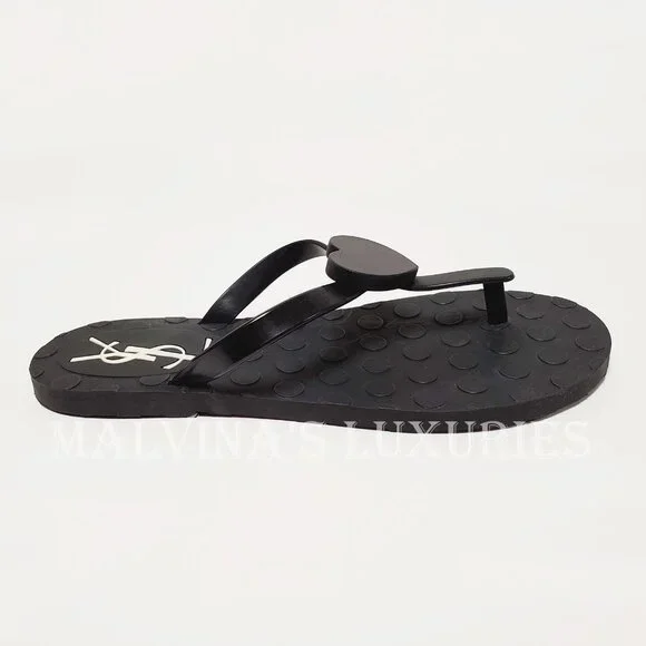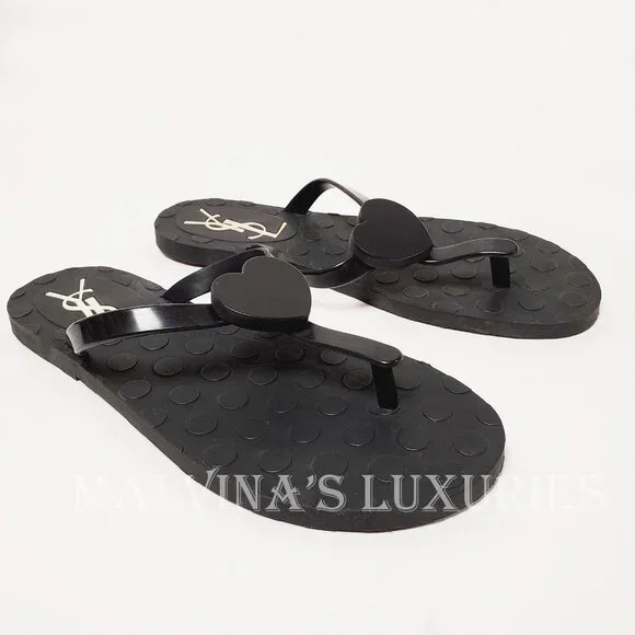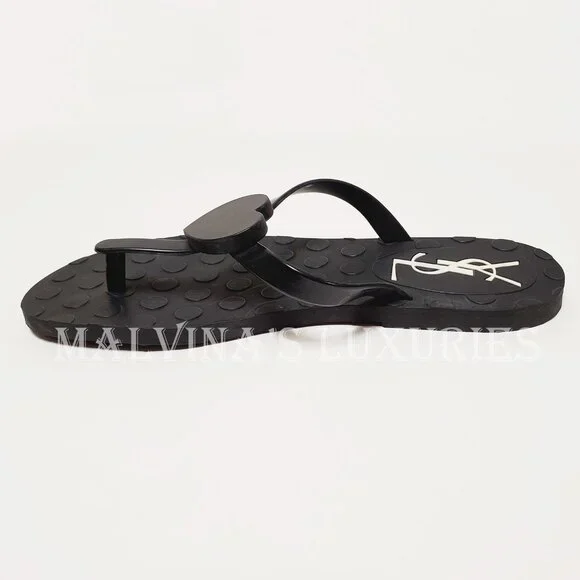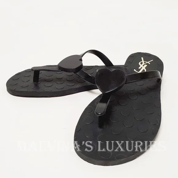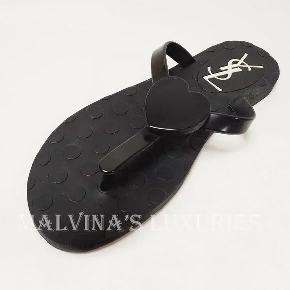 YVES SAINT LAURENT SHOES BLACK RUBBER FLIP FLOPS THONG w HEART sz 38 / US 8