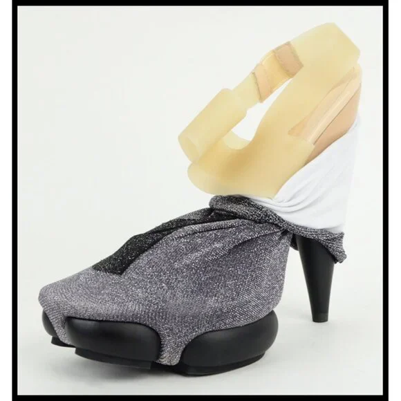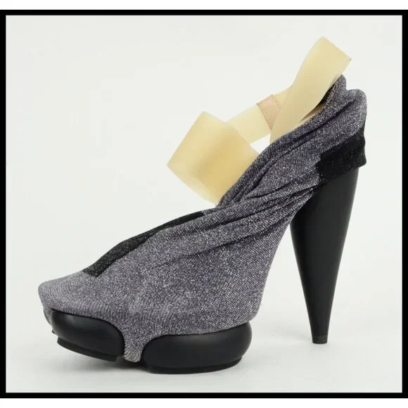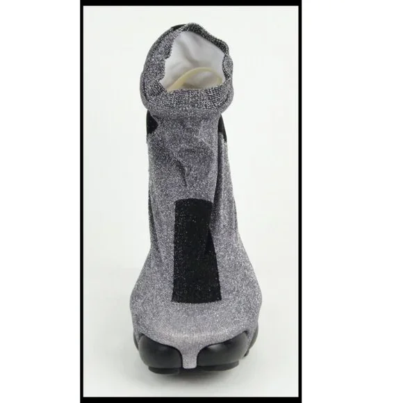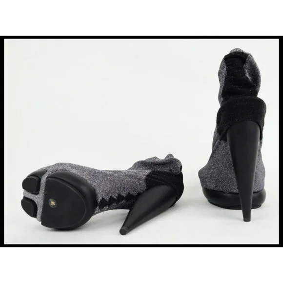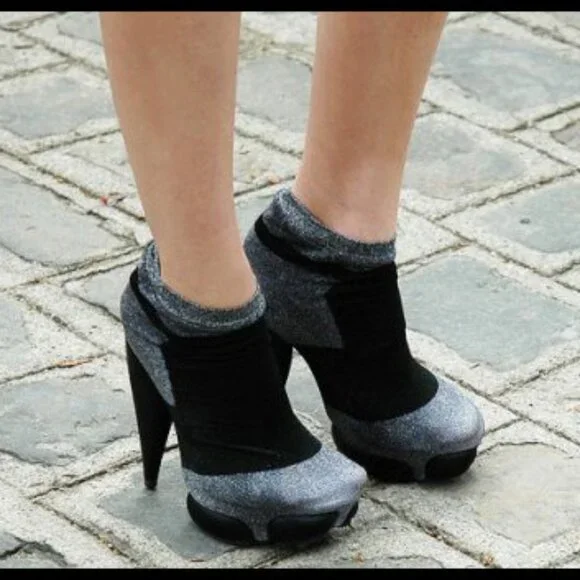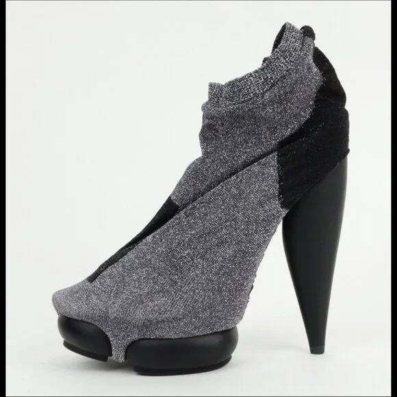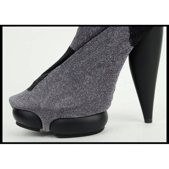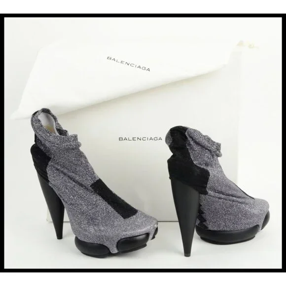 Designer: BalenciagaCondition: Authentic and Brand NewSize: IT 38 / US 7.5 (fits smaller than regular Italian Sizing)Material: Fabric, Rubber SoleUnique Features: Jersey Fabric with Metallic Shimmer, Rubber Sole, Conical HeelColor: Contrasting Gray / Black, please note that color appearance may vary depending on your monitor settingsMeasurements: Heel Height is approx. 5.8" with 1.7" Platform, Insole is 23.9cm (9.4")Malvina´s Luxe (Malvina´s Luxuries) is a trusted name in designer merchandise since 2001, we pride ourselves on offering authentic, brand new items that are carefully packaged and come from a smoke free environment. Our solid reputation on other platforms ensures that you can shop with confidence. Enjoy amazing deals on luxury items and join our community of satisfied customers!