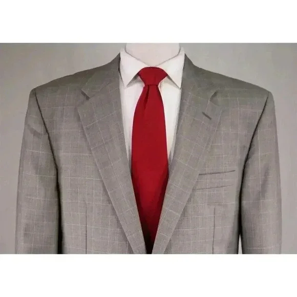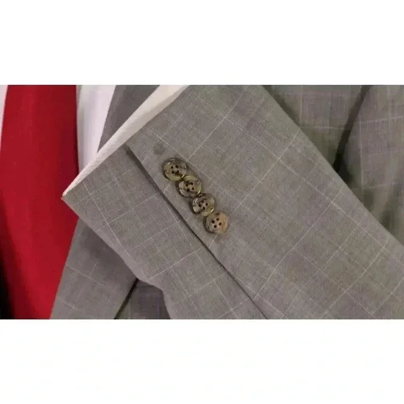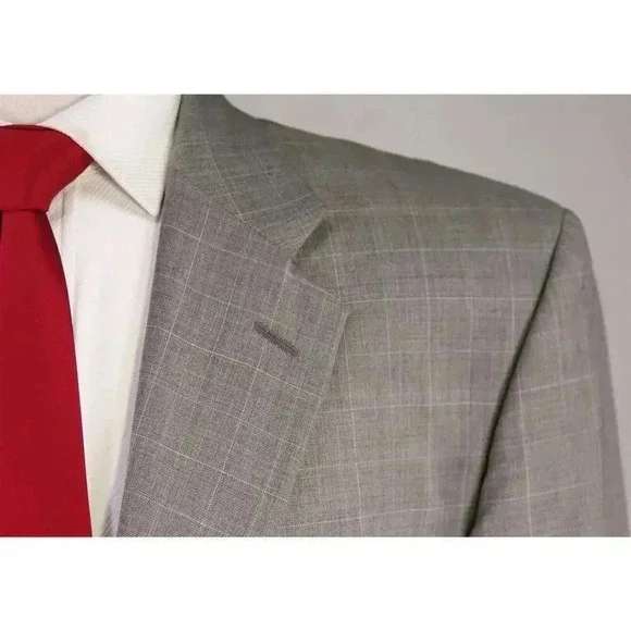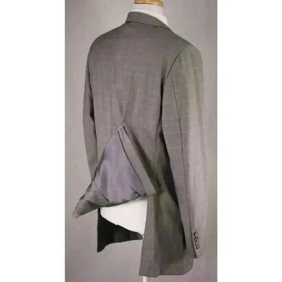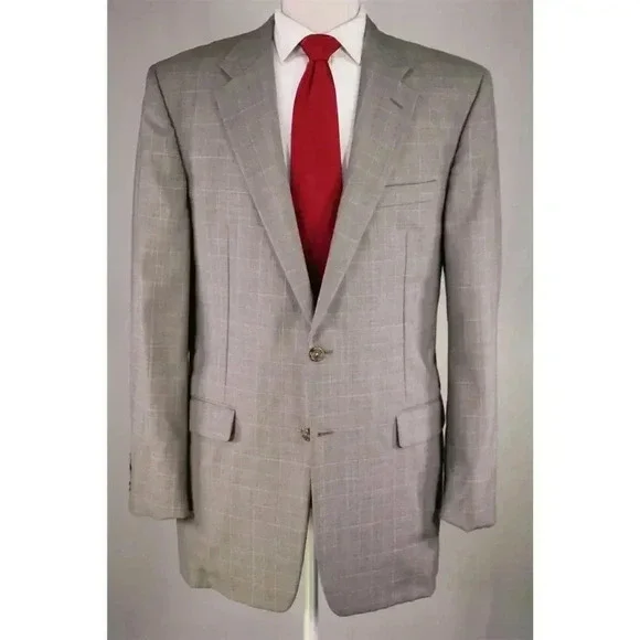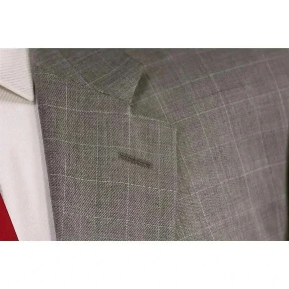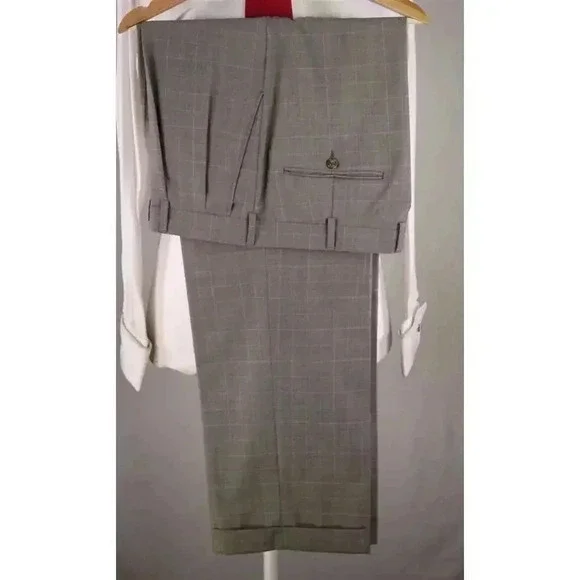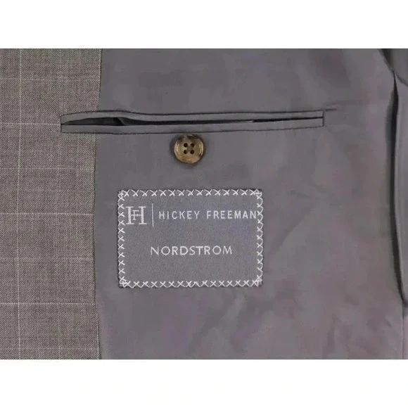 Brand: Hickey-Freeman * Size: 44L . Please follow my measurements * Measurements (Laying flat, Unstretched):Jacket:Underarm to Underarm on back: 22 inchesLength on back(from under the collar): 33 inchesWaist (at the middle/top button): 22 inchesShoulder to shoulder: 19 inchesSleeves from shoulder seam to end of cuff: 27 inchesExtra material to sleeves: 1.5 inchesPants:Pants Waist: 36 InchesExtra material on waist: 2.25 InchesPants Rise: 12.5 Inches (Measurement between the waistline and the crotch)Pants inseam: 31 InchesExtra material on inseam: 5.5 Inches uncuffedOpening at hem: 9.5 inches* Material: 100% Wool Weight: Medium to Light Weight* Color: Grayish Brown w/ Ice Blue* Design: Windowpane* Jacket:Two Button Single BreastedDual VentFour Interior PocketsThree Exterior PocketsFour Faux Buttons on the cuffsFully Lined* Slacks:Double PleatsCuffed HemsSlanted Front PocketsLined to the kneesTwo Back Pockets* Made in USA* Condition: Gently Used. No stains or tears. Missing a button on the back pocket of the pants.* Inventory Code #S13441Powered by SixBit´s eCommerce Solution