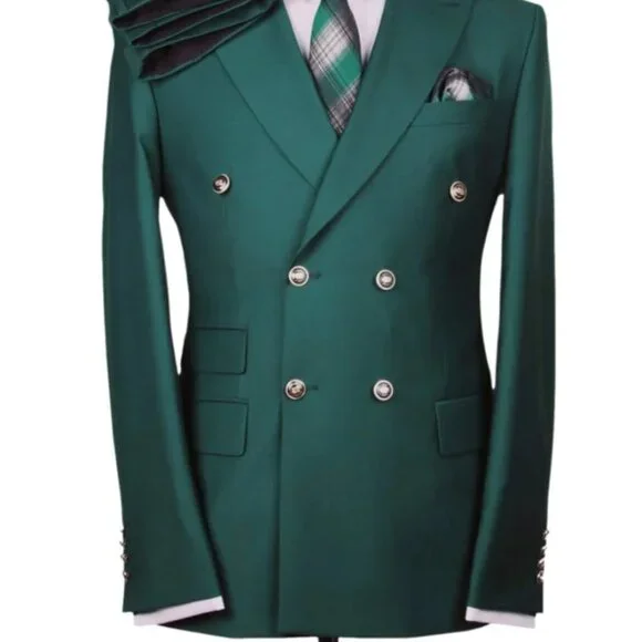 "This modern fit suit comes in a double breasted style and features six gold buttons, wool fabric, modern fit flat front pants, side vents, and a wide peak lapel. Perfect for any event."