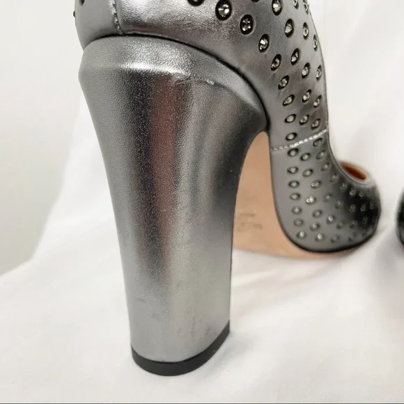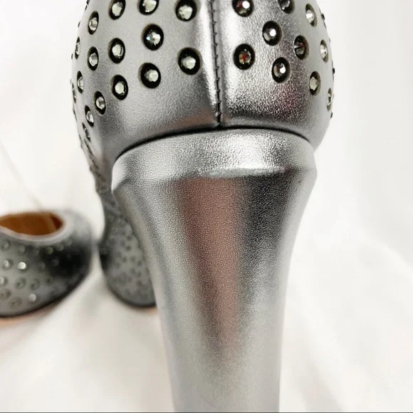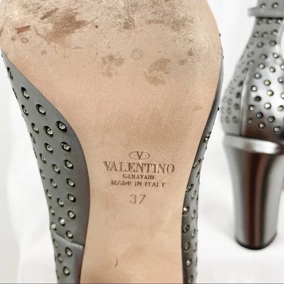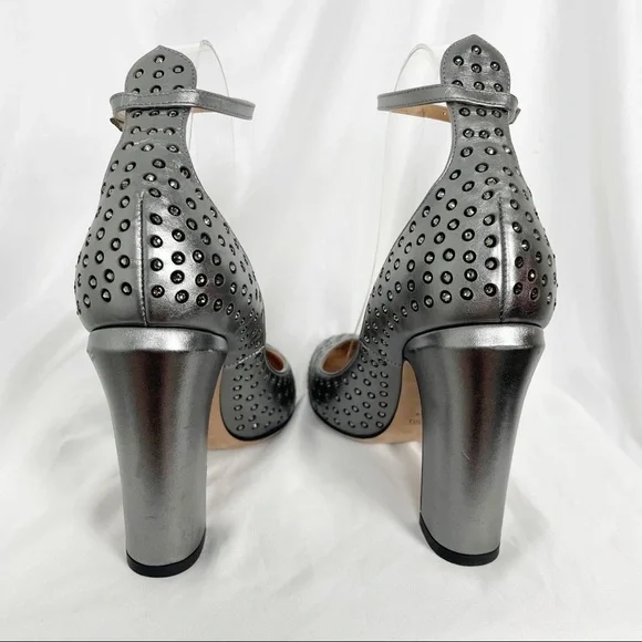 Valentino Garavani Tango Crystal Embellished Pumps- Excellent pre-owned condition - minor scratches to back of heel as shown- 3.75in block heelRound toe, ankle buckle closure, metallic silver leather upper lining and sole. Crystal, rhinestone, studded. Casual, cocktail, formal, evening, party, NYE, New Years Eve, holiday, bridesmaid, evening, dressy, cute, heels, Christmas.