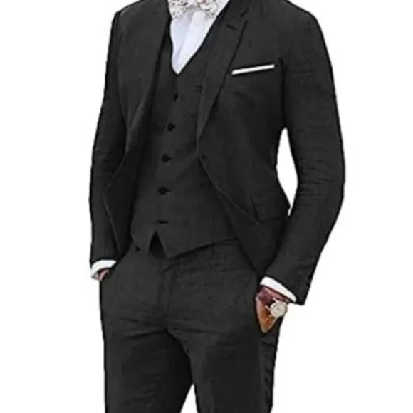 3 Piece Linen Suit - Black Mens Suit - Vested summer SuitButton ClosureNotch LapelSingle BreastedSlim Fit70% Rayon, 30% LinenOne Chest PocketTwo Flap Front PocketColor: Black