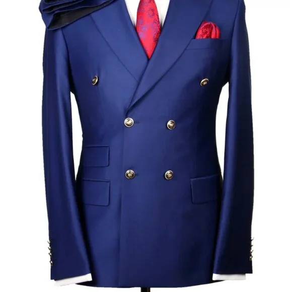 This modern fit suit comes in a double breasted style, it features 6 gold buttons to close, wool fabric, modern fit flat front pants, side vents, and a wide peak lapel