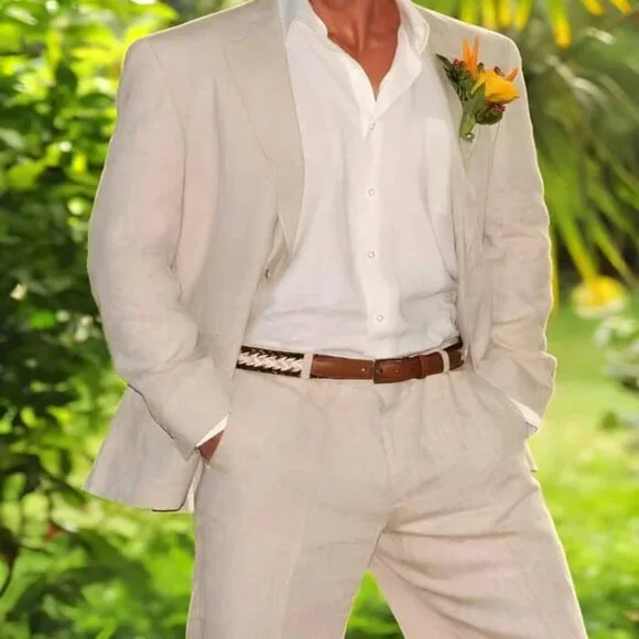 Mens 2 Button 100% Mens Linen Suit Kids Sizes Suit 100% Mens Linen Suit.Single Breasted 2 button, Dual Vents.Please note the Buttons are Tone on Tone. The same color as the suit.This Mens Linen Suit is the Perfect Wedding/ Lounge Suit.Color :Natural