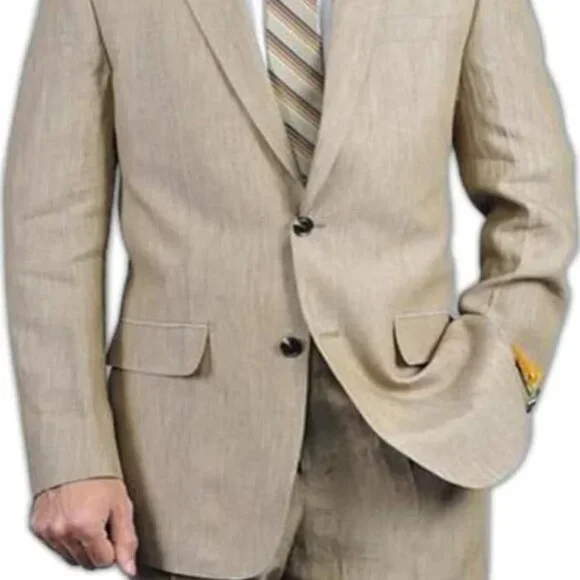 Beige Big and Tall Linen SuitElegant, Natural, and Light Weight 2-Button Notch Lapel Style.100% Fine Linen Suit.Two-button frontCenter vent stylingFlat Front pants6 inch dropColor: Beige