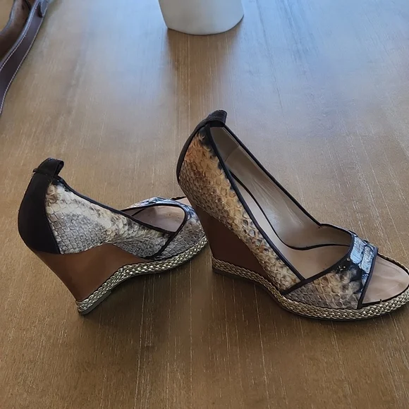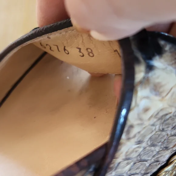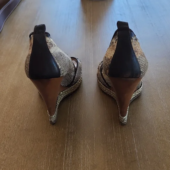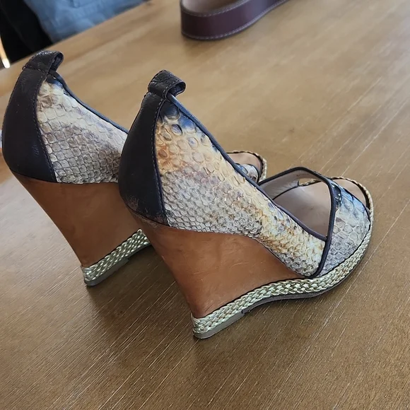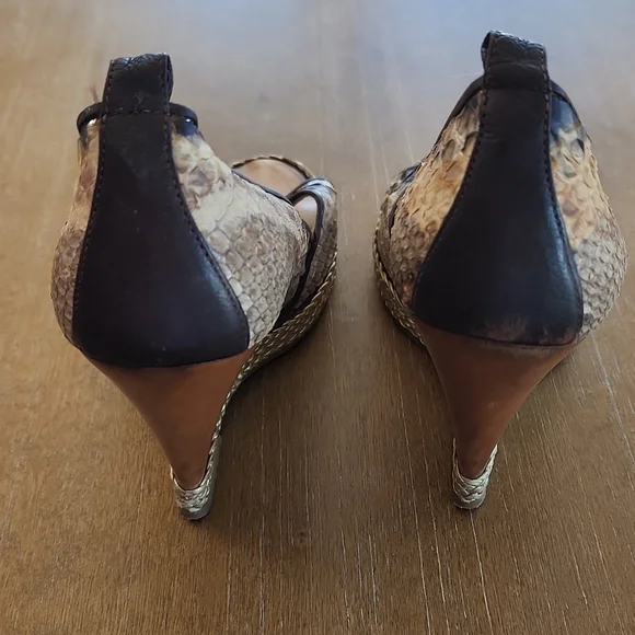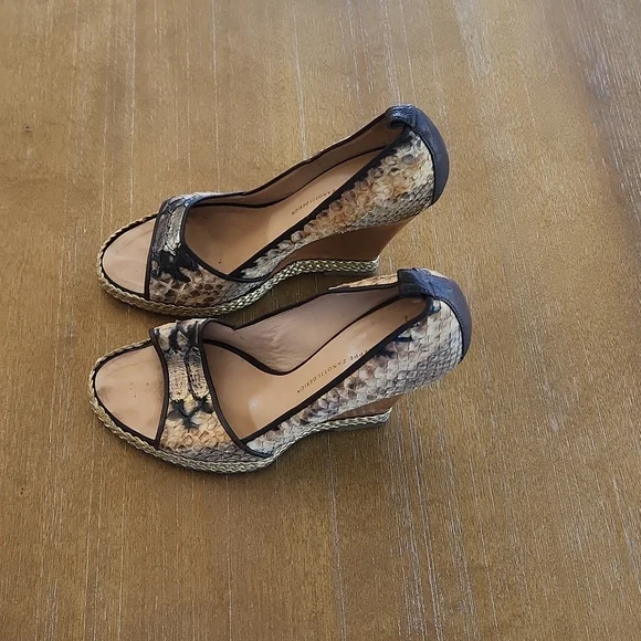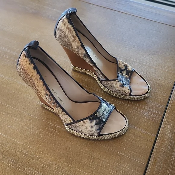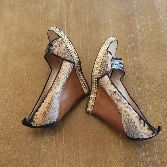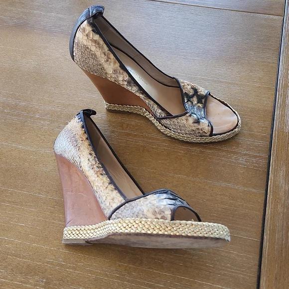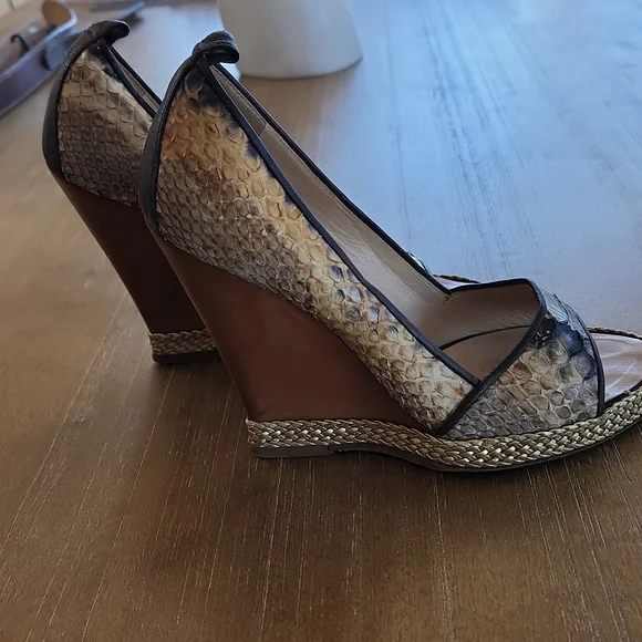 design. sneakskin and leather open toeshoe.Edged in gold leather rope design.Just beautifully done. Size 38.These shoes are in great condition.1 small scuff but not through the leather. just a scuff. See last picture.