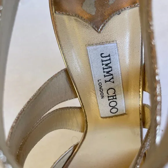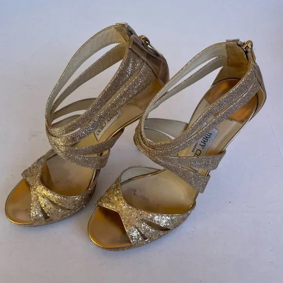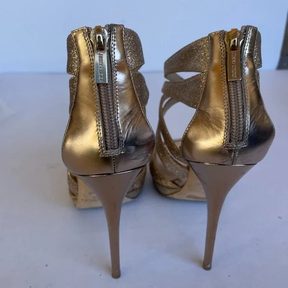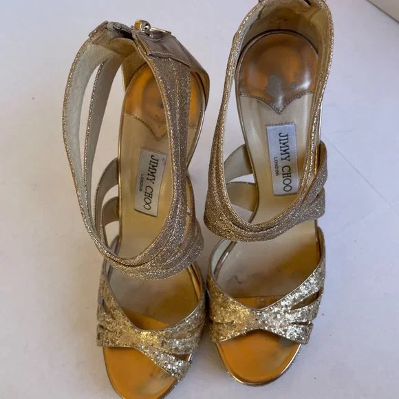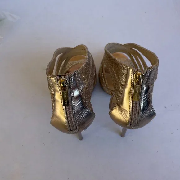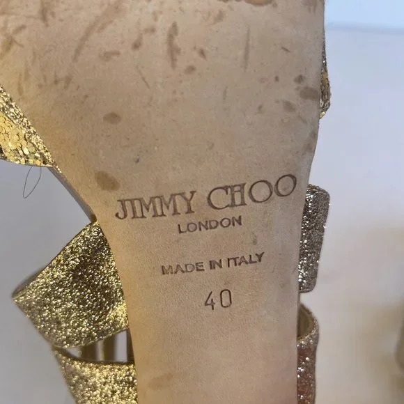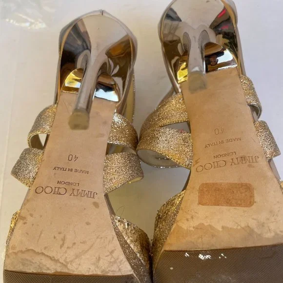 Jimmy Choo Metallic Gold Sandals Sz 40 Glitter Strap Platform Stiletto Heels