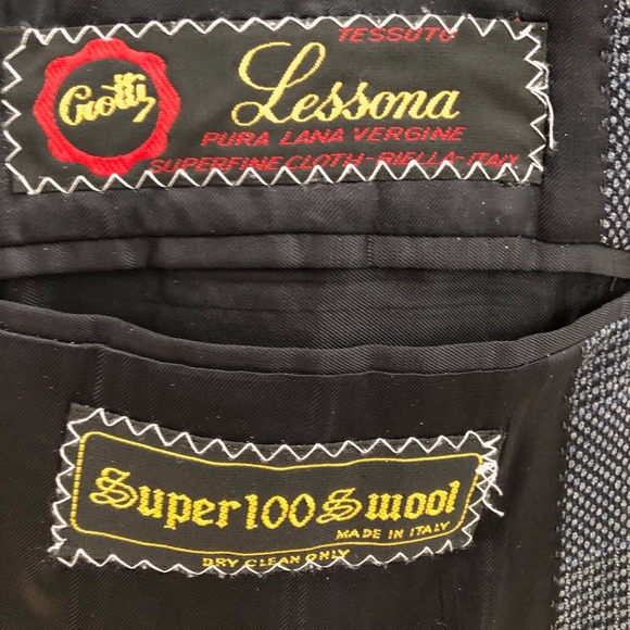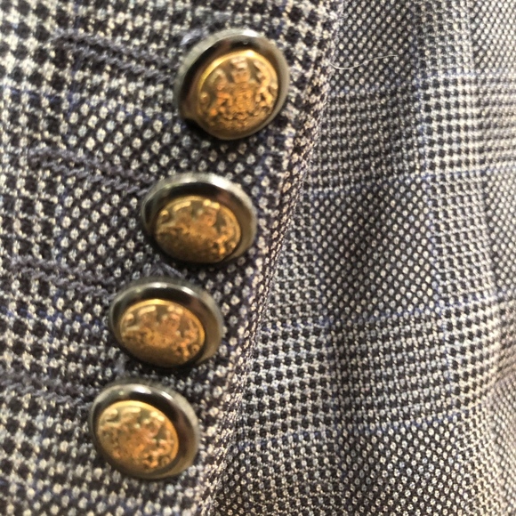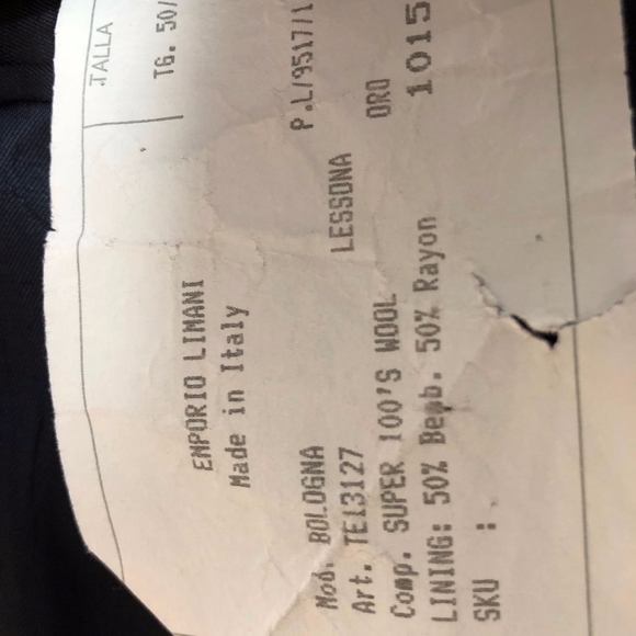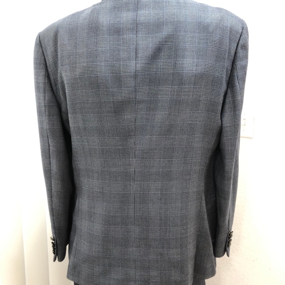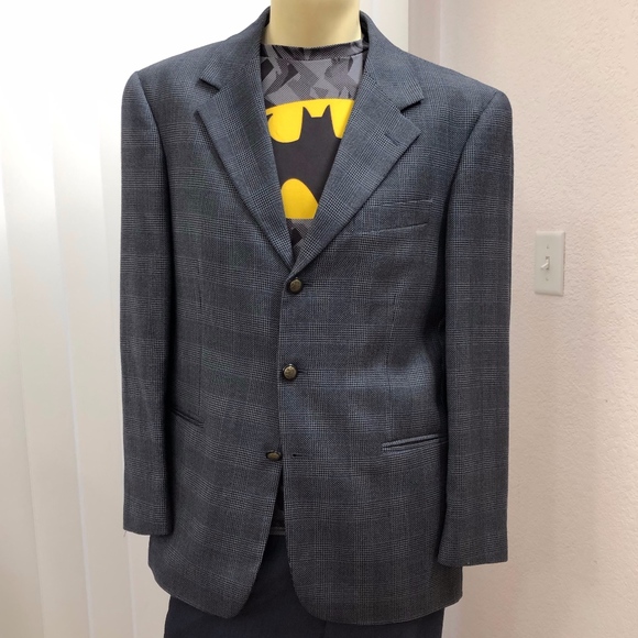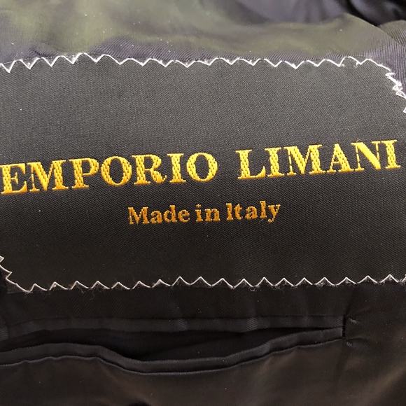 NWOT. Three-button EMPORIO LIMANI athletic-cut blazer is a masterpiece in blue/black patterned. Super 100% wool. Made in Italy.Size 40R US. Measurements: Sleeves 23.5", length 30" from collar, Shoulders 26". Perfect condition. All proceeds go to charity.