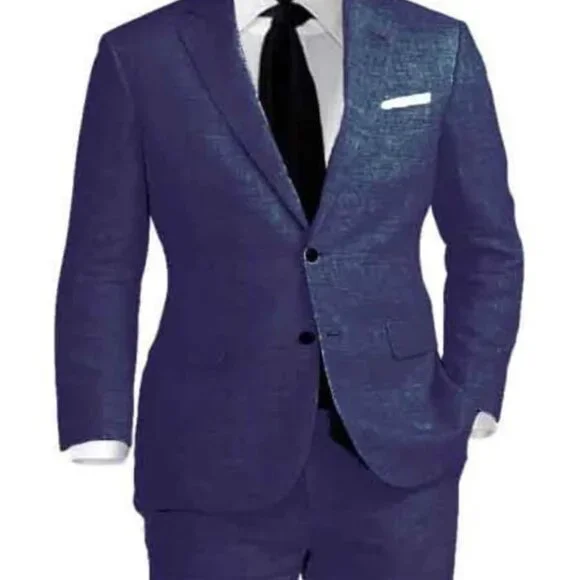 Two Button Navy Linen For Beach Wedding outf SuitTwo ButtonSpread Notch LapelSingle BreastedOne Chest PocketFlap Front PocketsFour Button CuffMaterial: LinenColor: Navy Blue